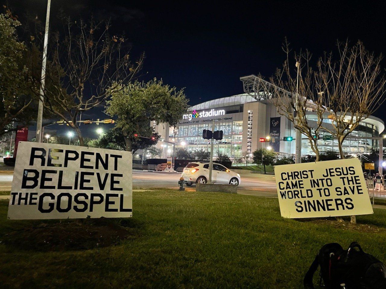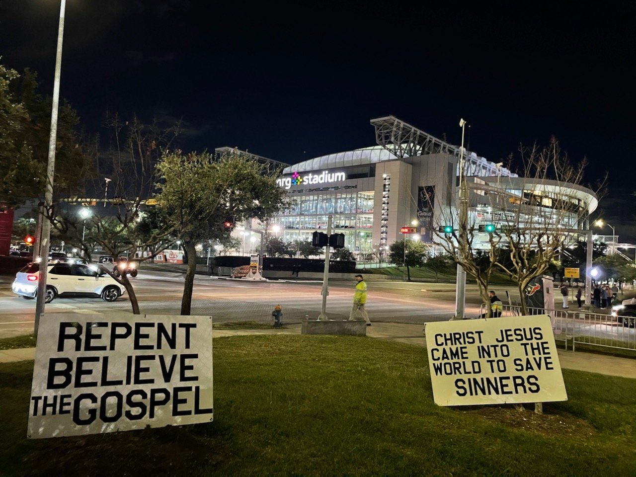 Christ Jesus came into the world to save Sinners! This is a picture of stadium and my signs after the fans made it in and I finished preaching.