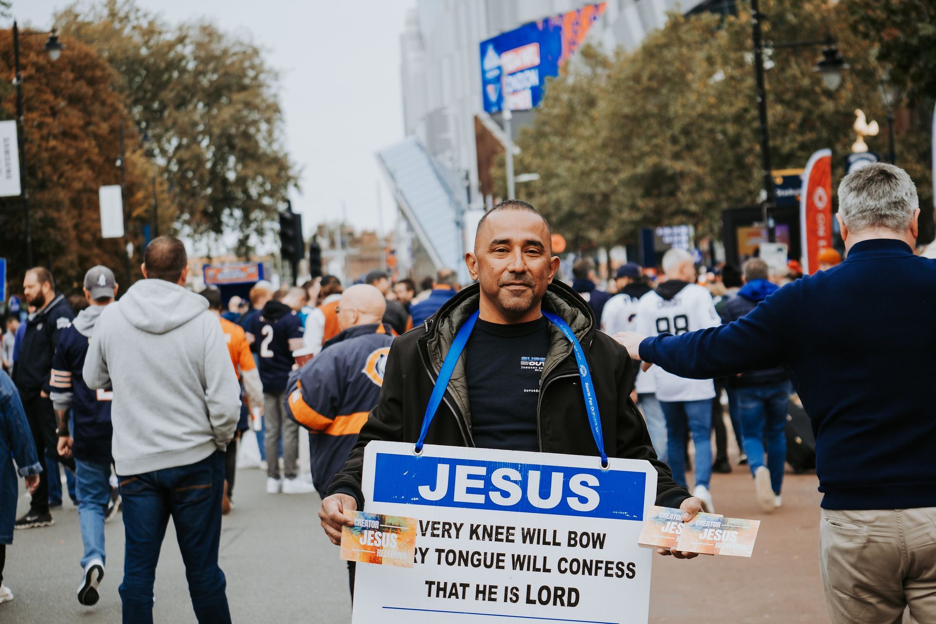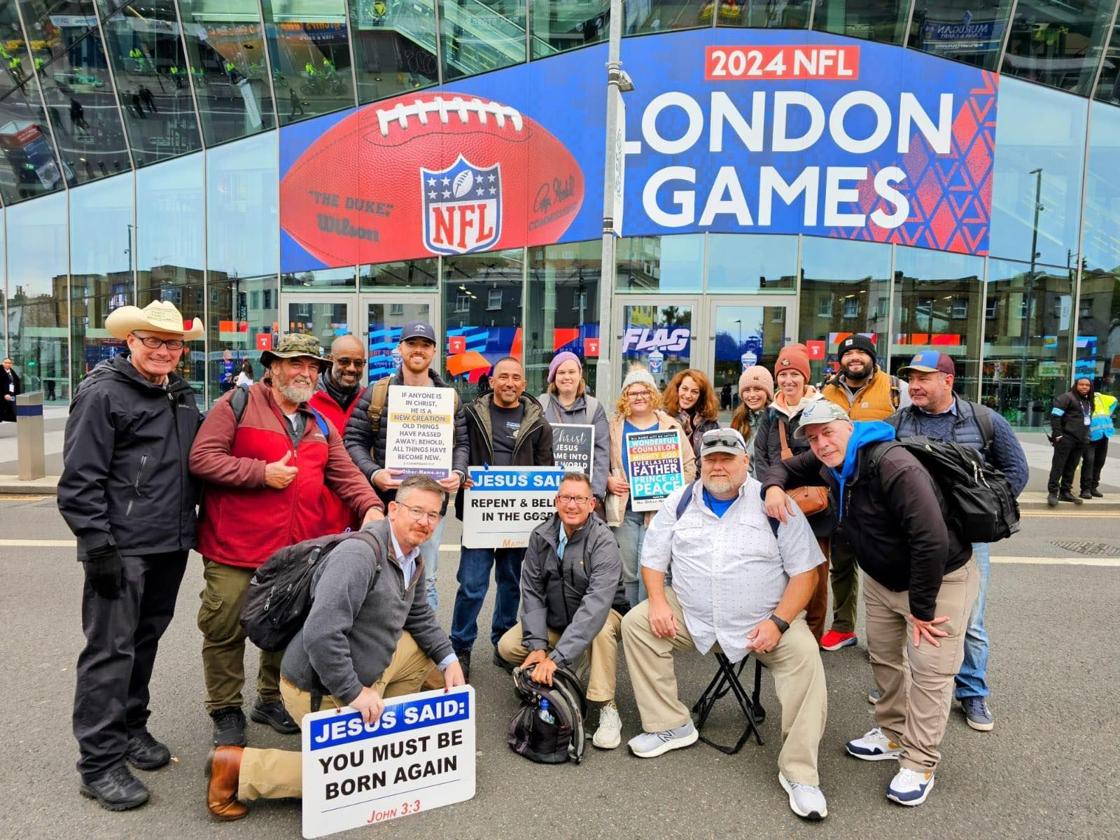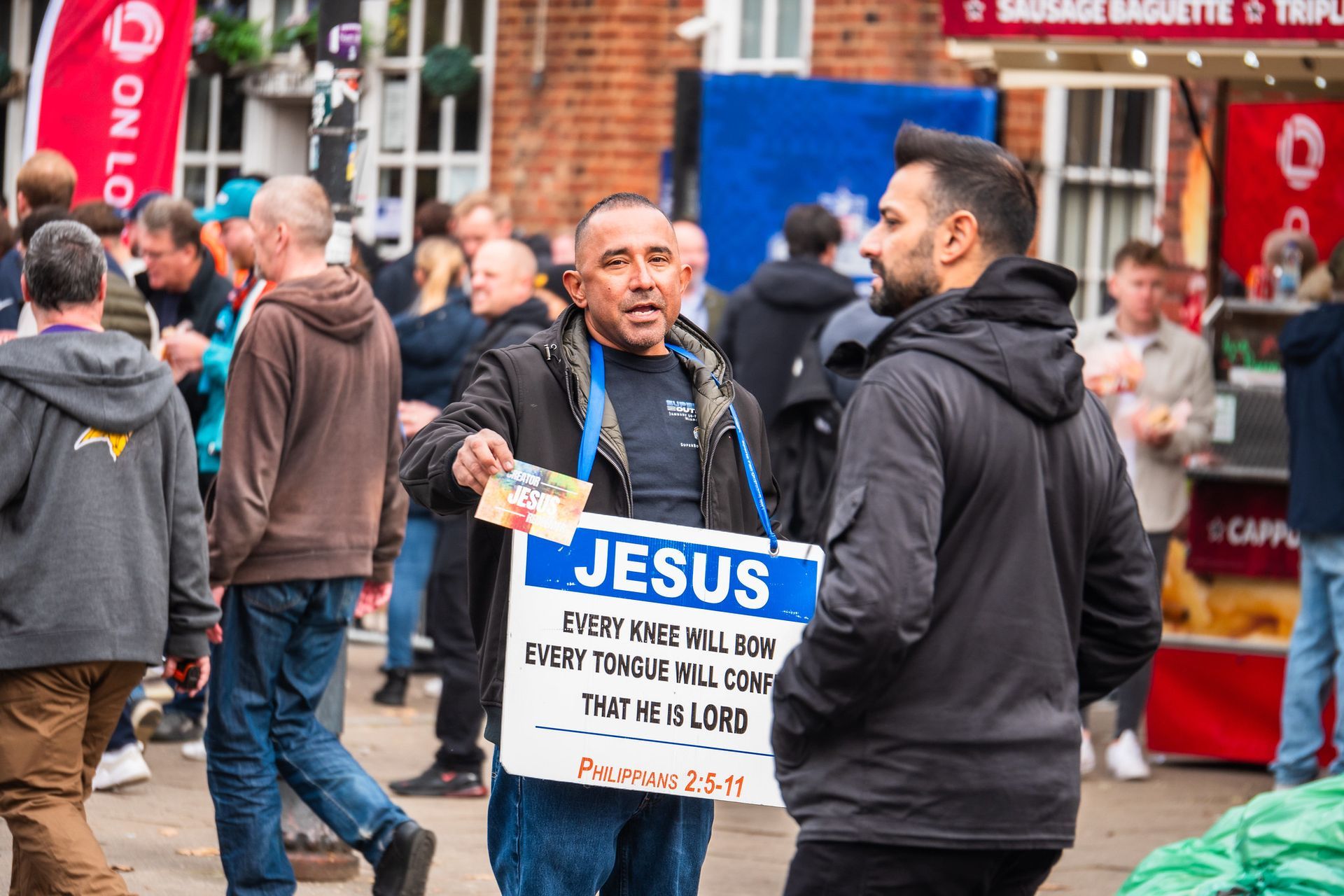 If you are a present open air Gospel preacher or want to begin, pray about joining the Team for these 10 days of prayer, fellowship and 6 - 8 hours per day of ministry to fans and local citizens. These are pictures from previous outreaches in London: NFL London ’18 , NFL London '19, NFL London '22, NFL London '23, and at the Cricket World Cup.