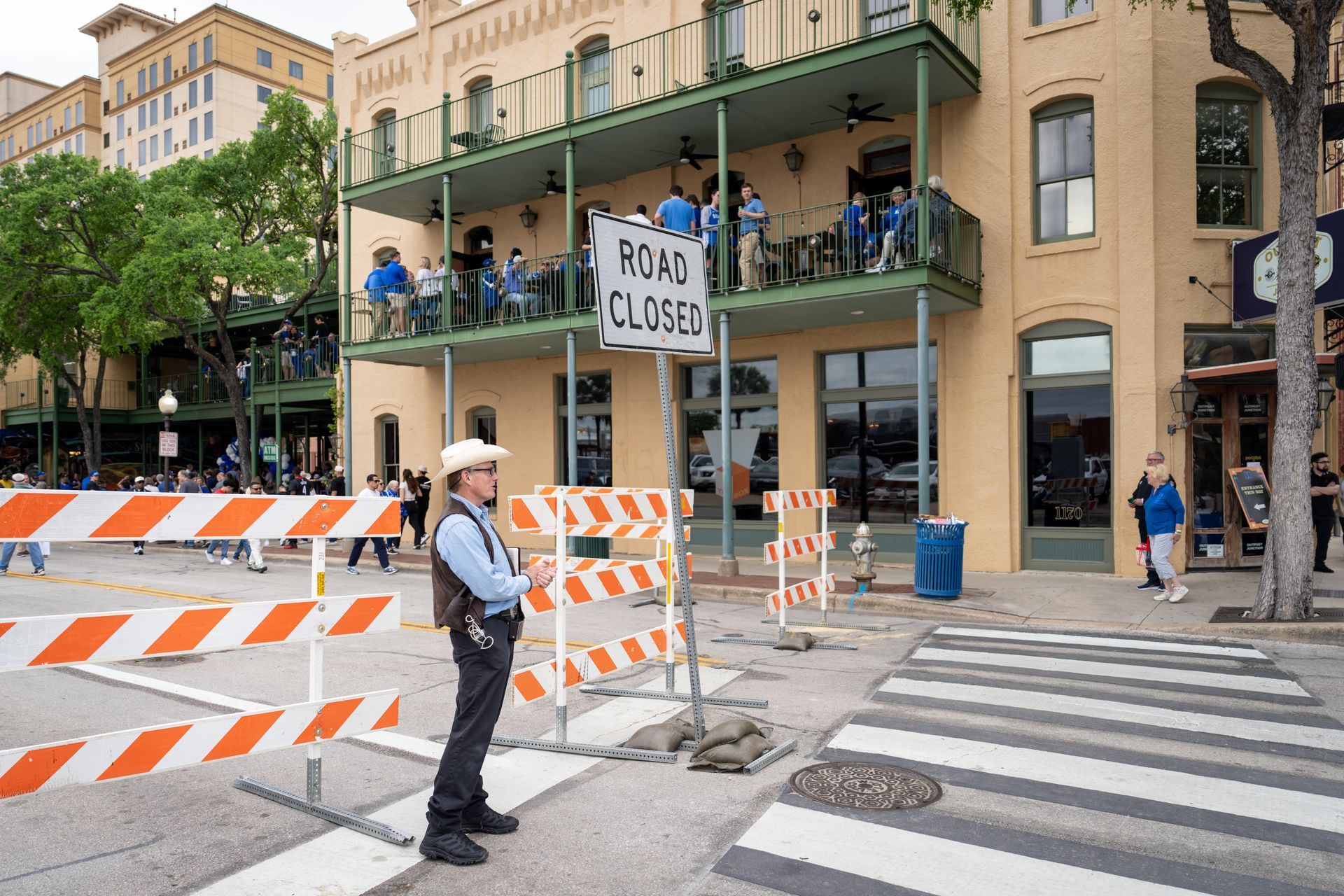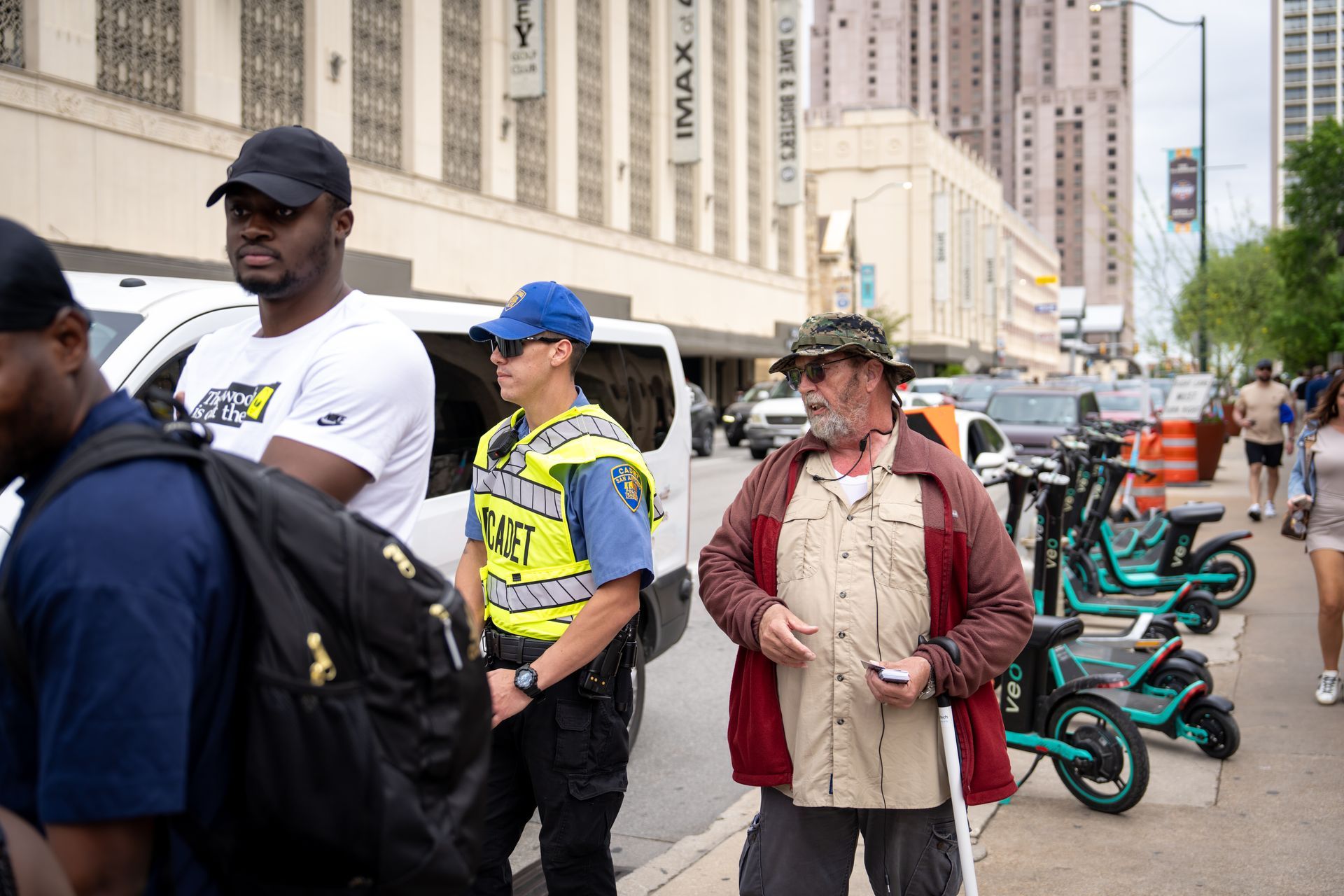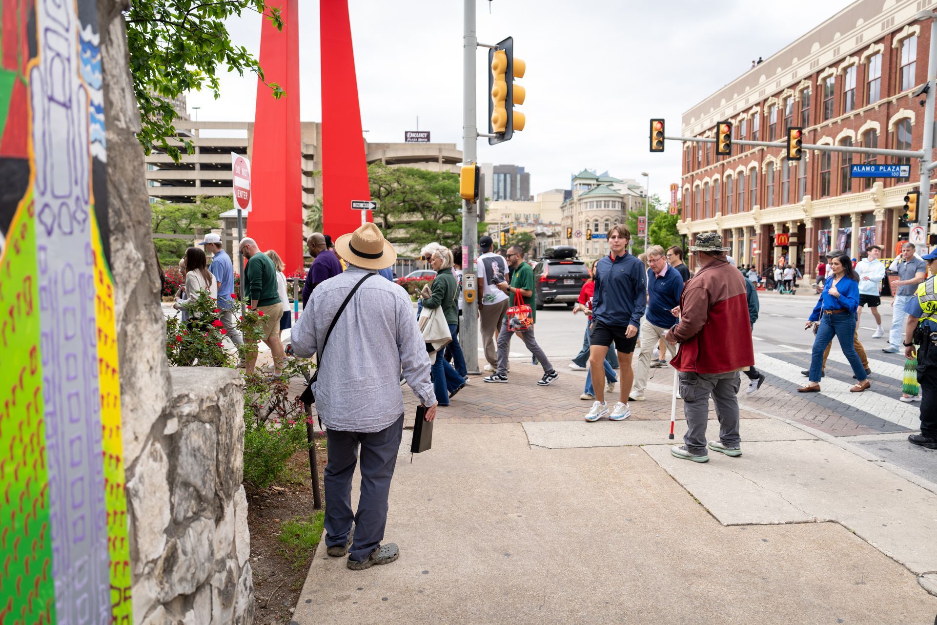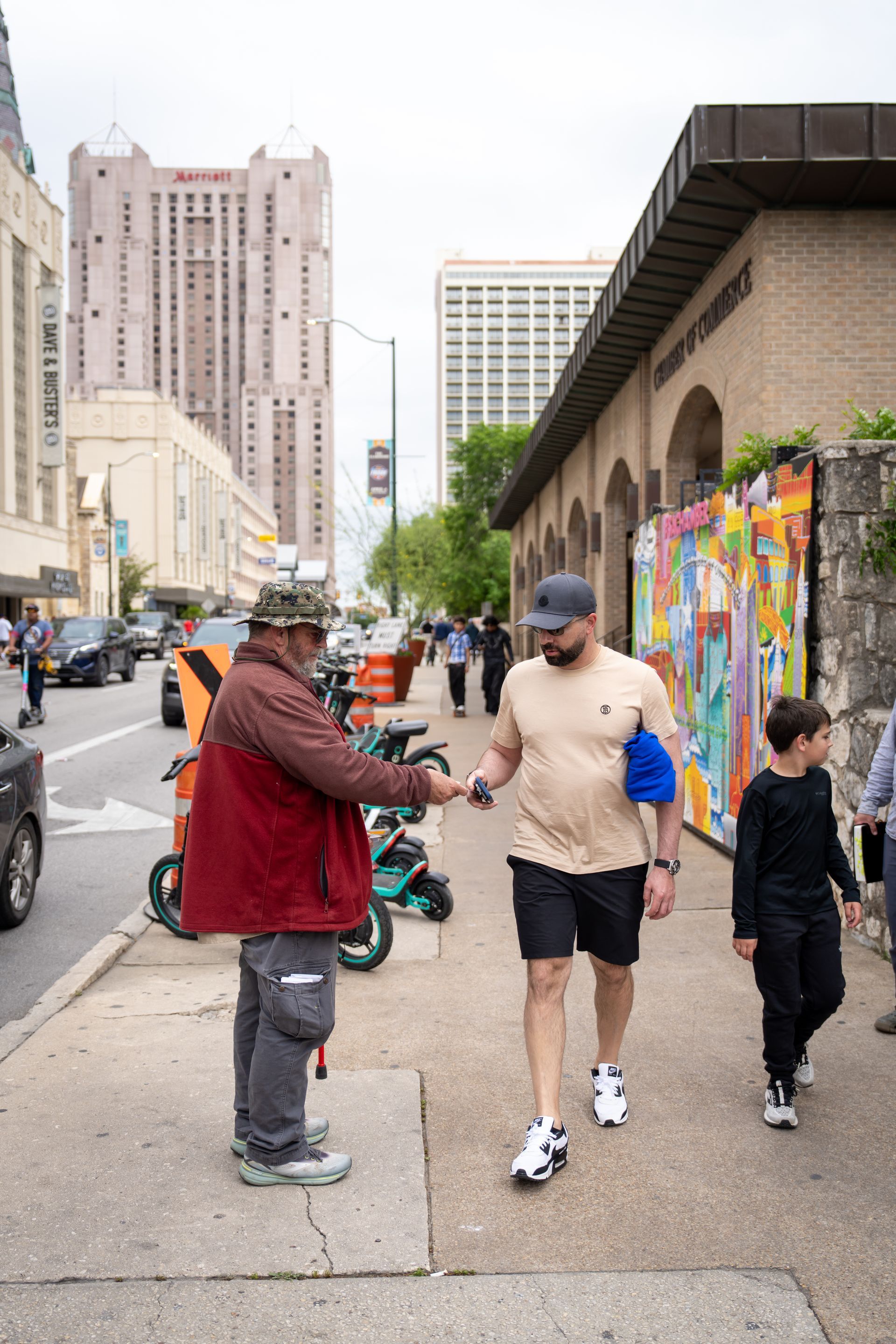 Bill Adams surveys the preaching location in downtown San Antonio.