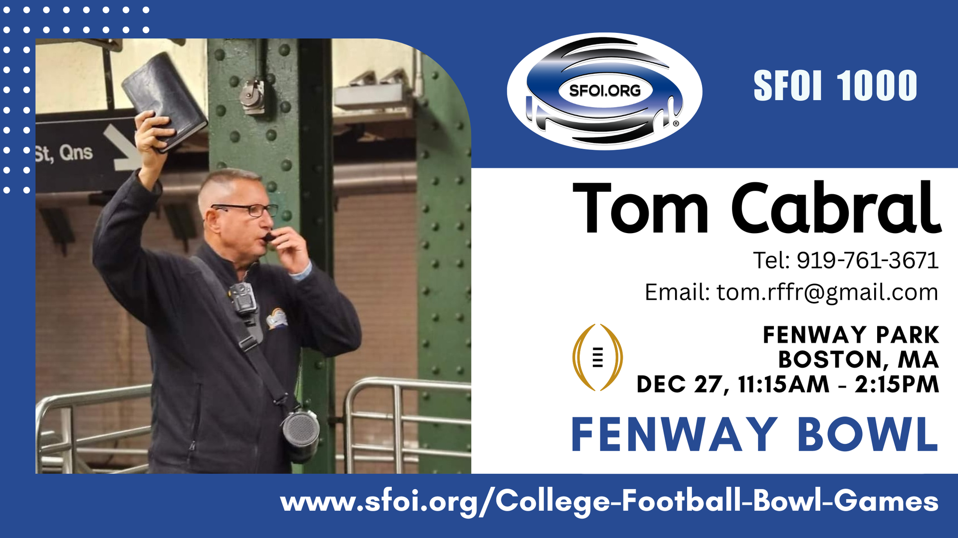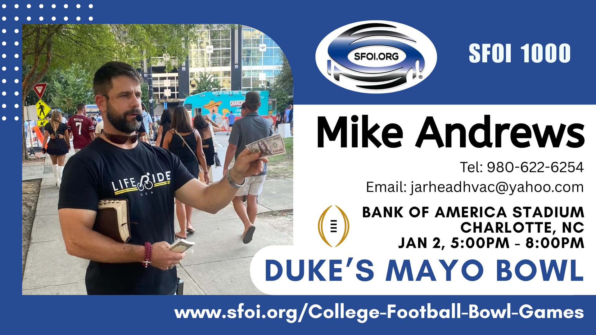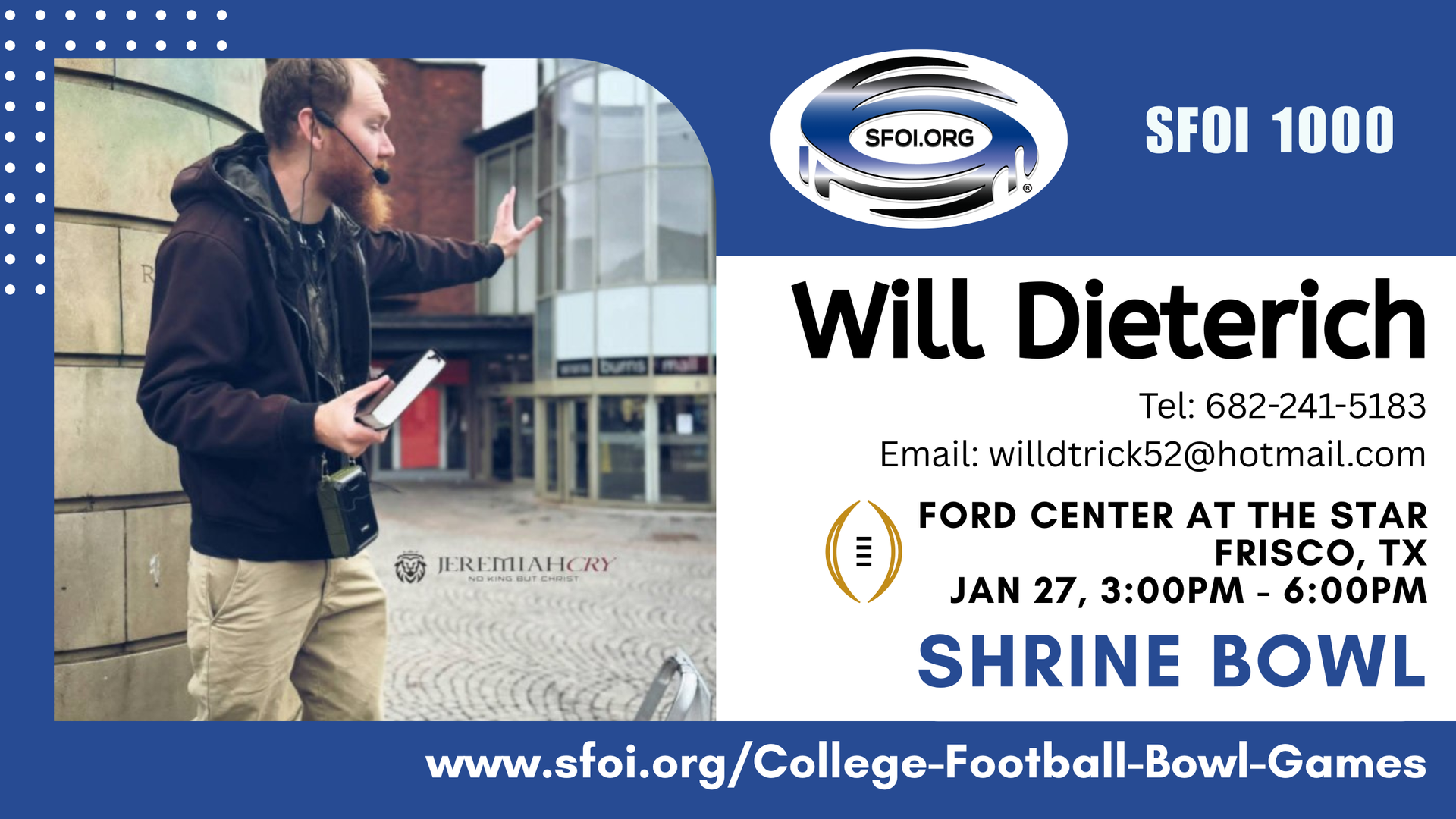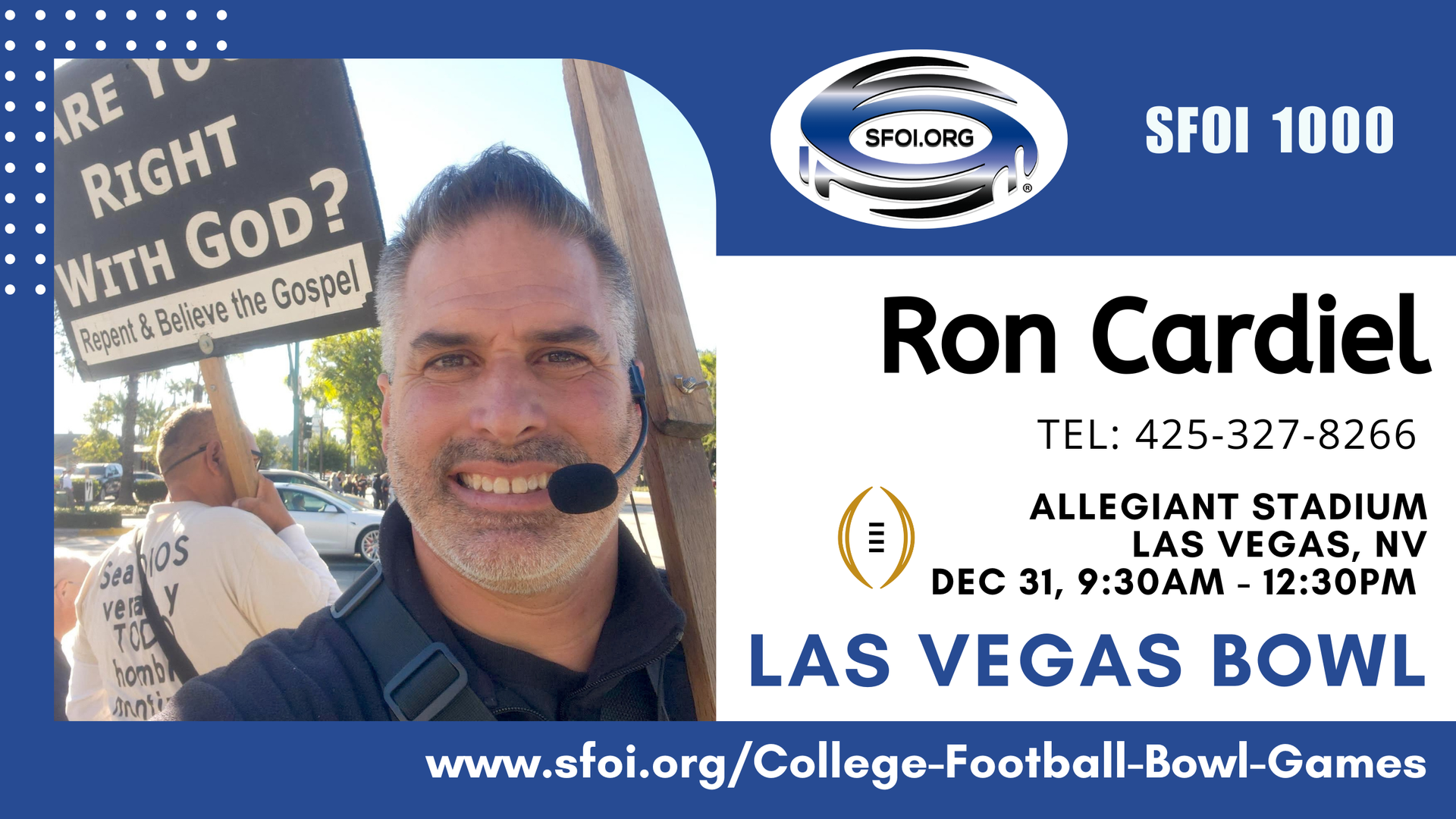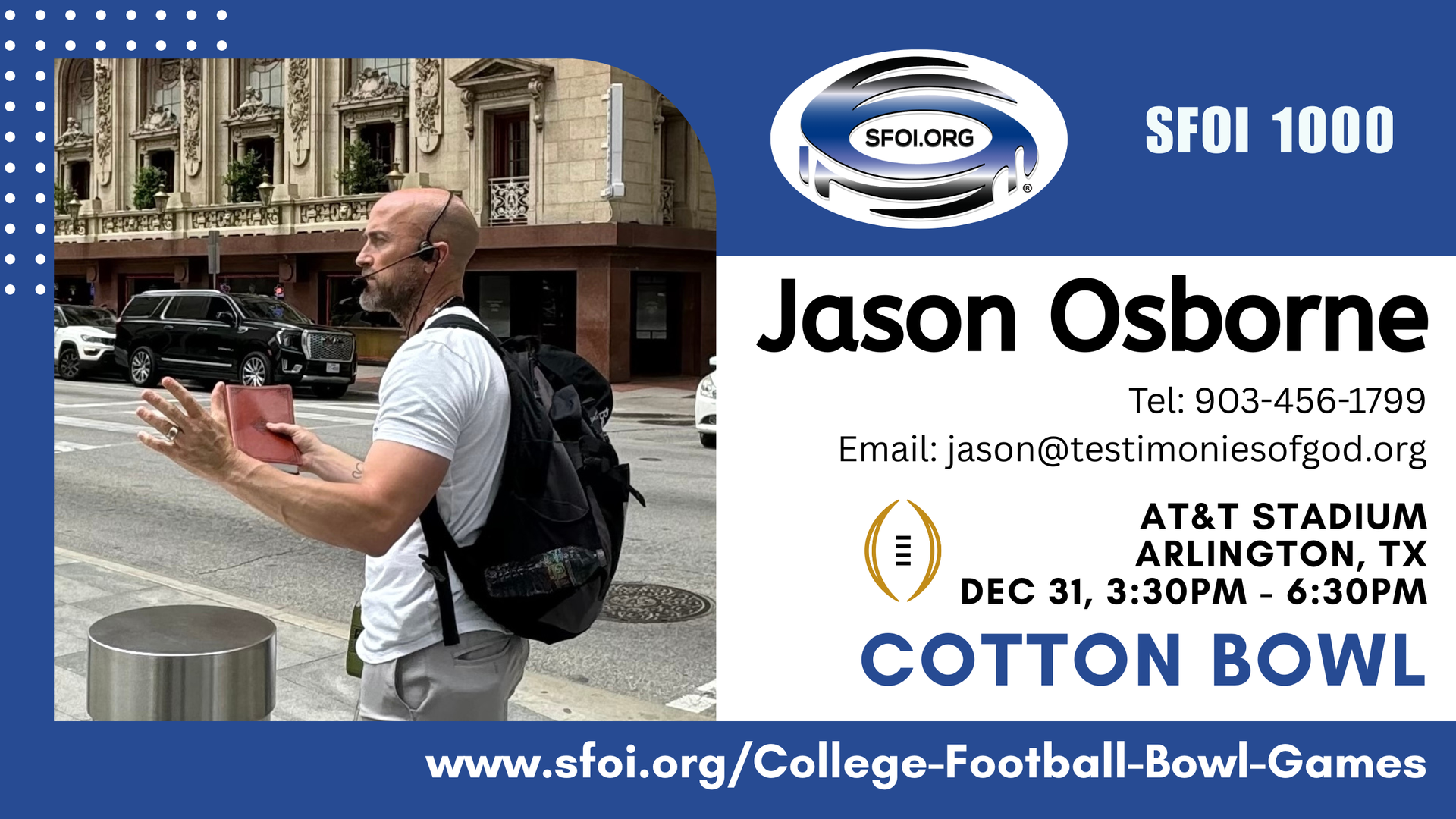 If you can preach at one or more of these Bowl Games then please email: info@sfoi.org or text: 423-250-9308. Click the link of the game and the page will scroll down for you to see the details: location, time, etc.