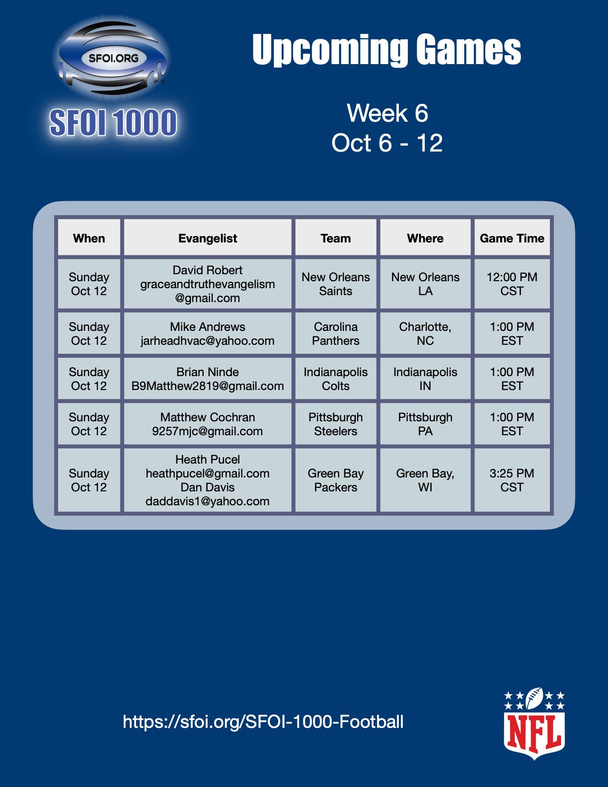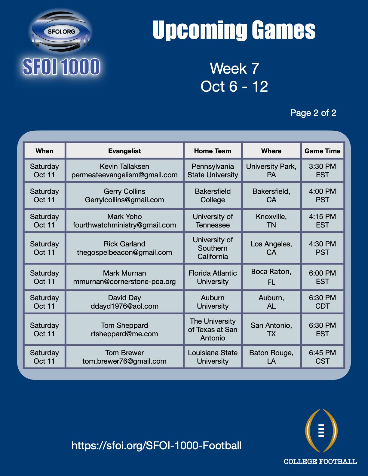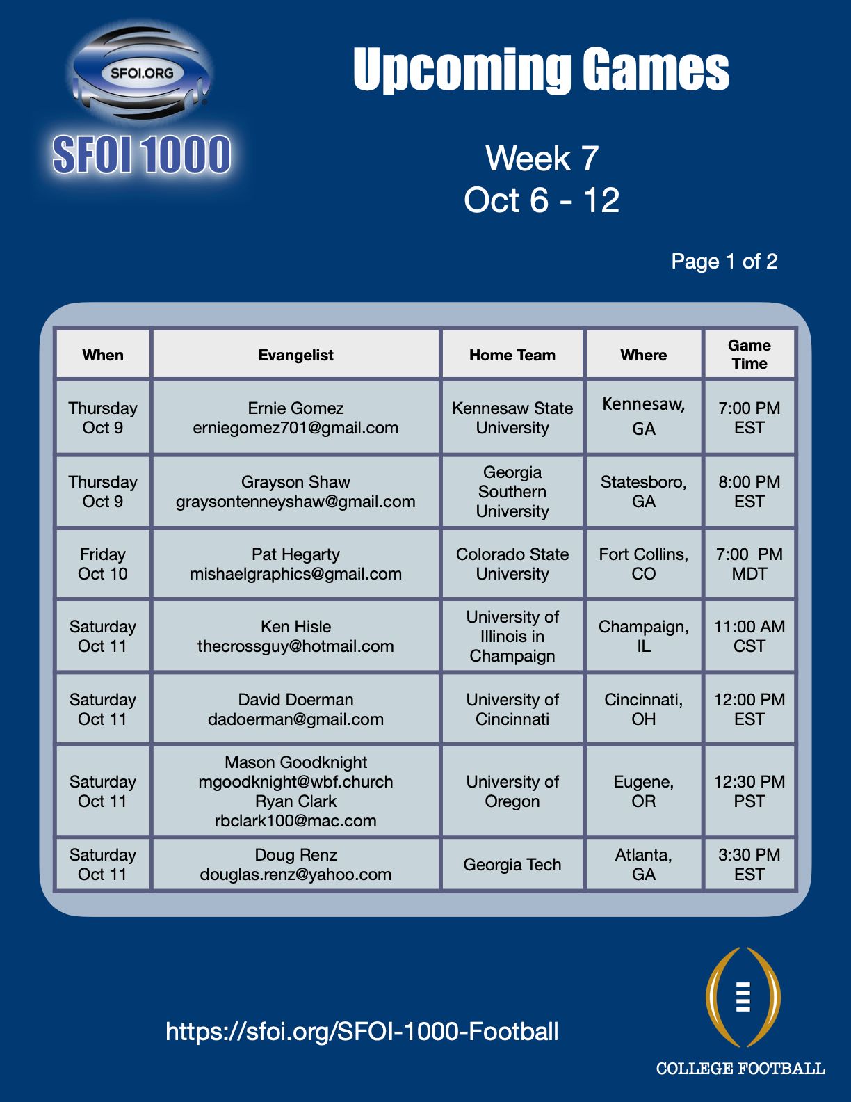 The SFOI 1,000 Football is a movement to have the Gospel preached Lord willing at every NCAA Division I college and NFL home game this fall.