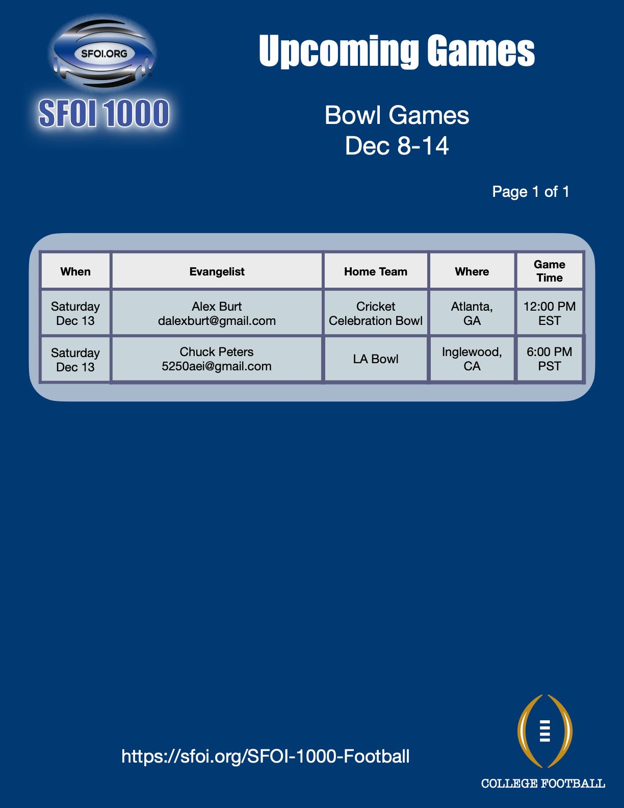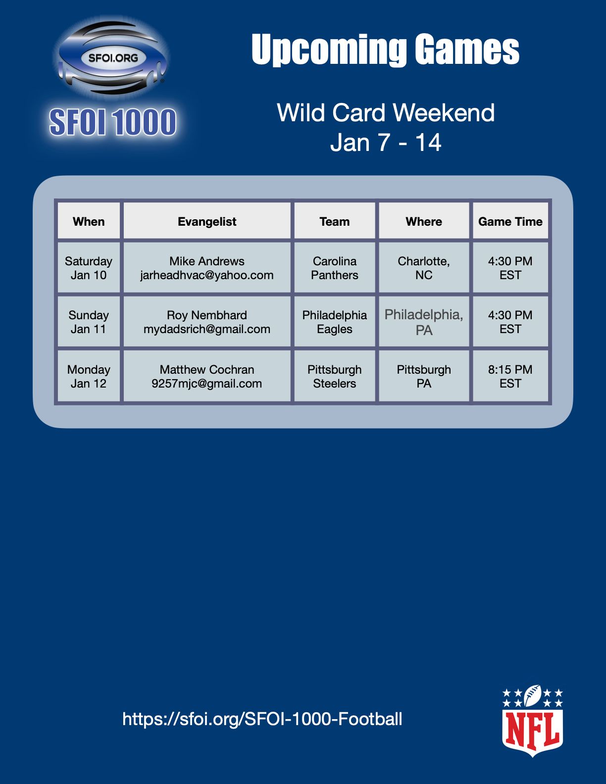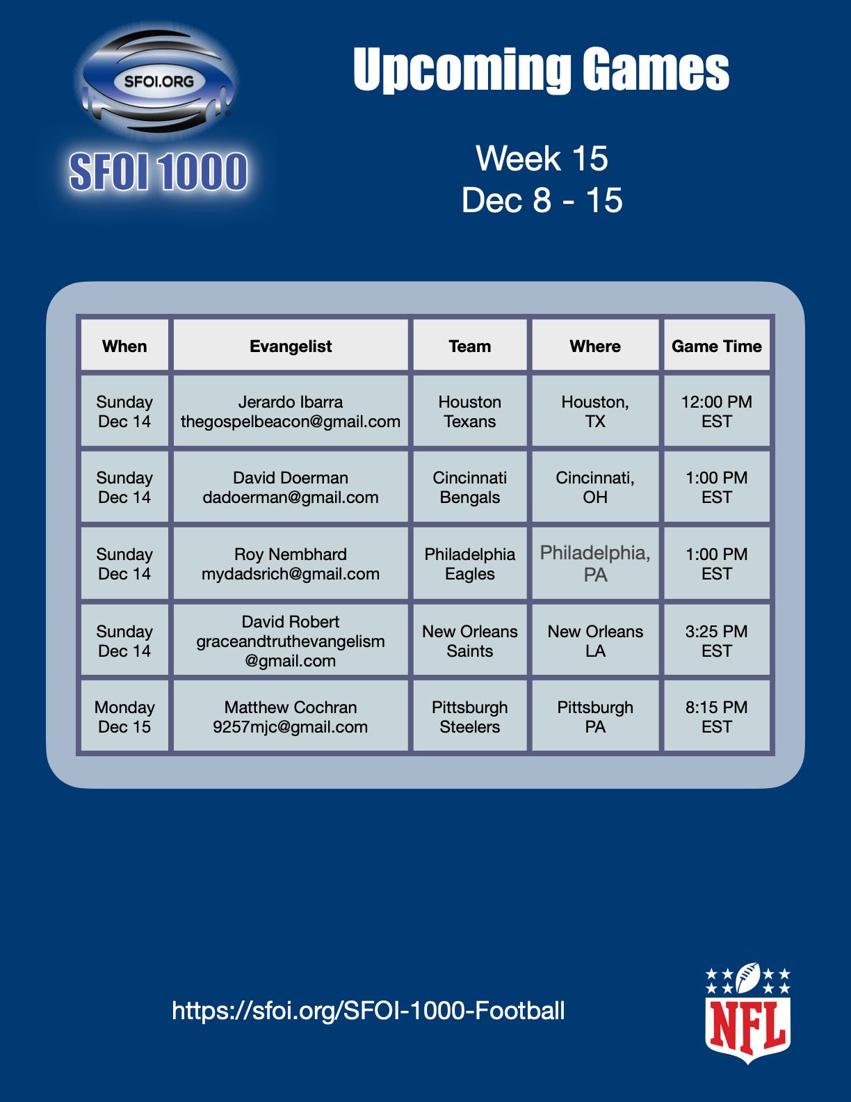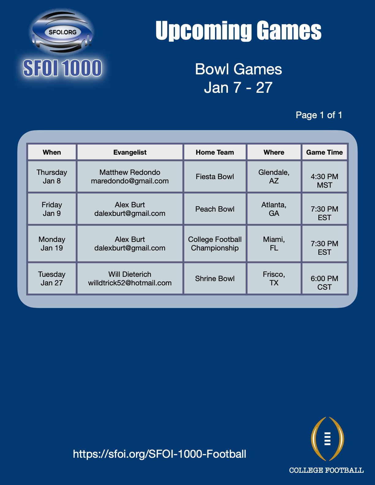 The SFOI 1,000 Football is a movement to have the Gospel preached Lord willing at every NCAA Division I college and NFL home game this fall.