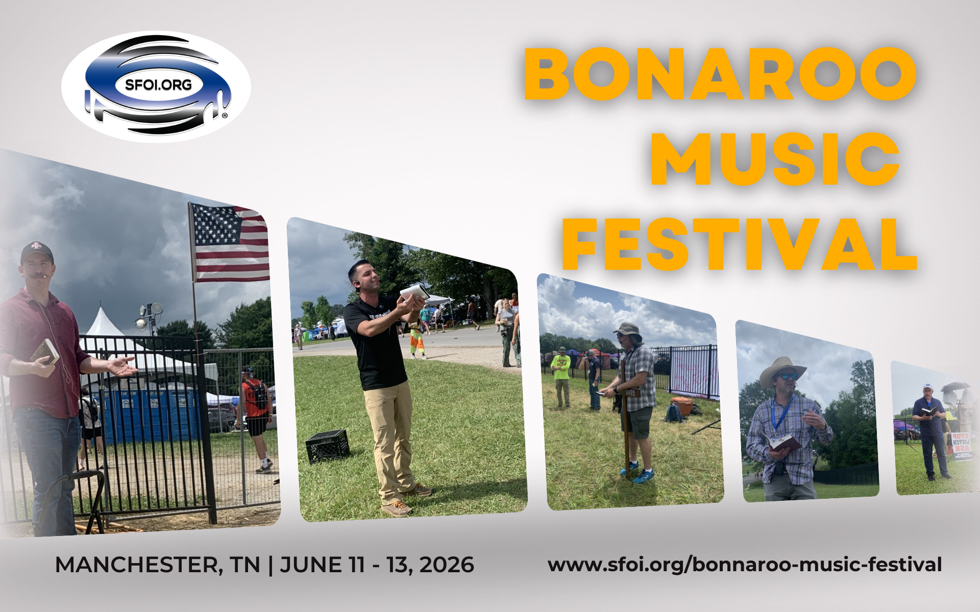 The Bonaroo Music Festival is one of the largest such events in the U.S. bringing in approximately 80 to 100 thousand people each year. The Festival is located on a 700 acre farm in Manchester. There is a public county road that runs right through the heart of it and provides great ability to preach to multitudes of people. It is truly a dark place with open blatant immorality and sin, where people need to be confronted with the Gospel.