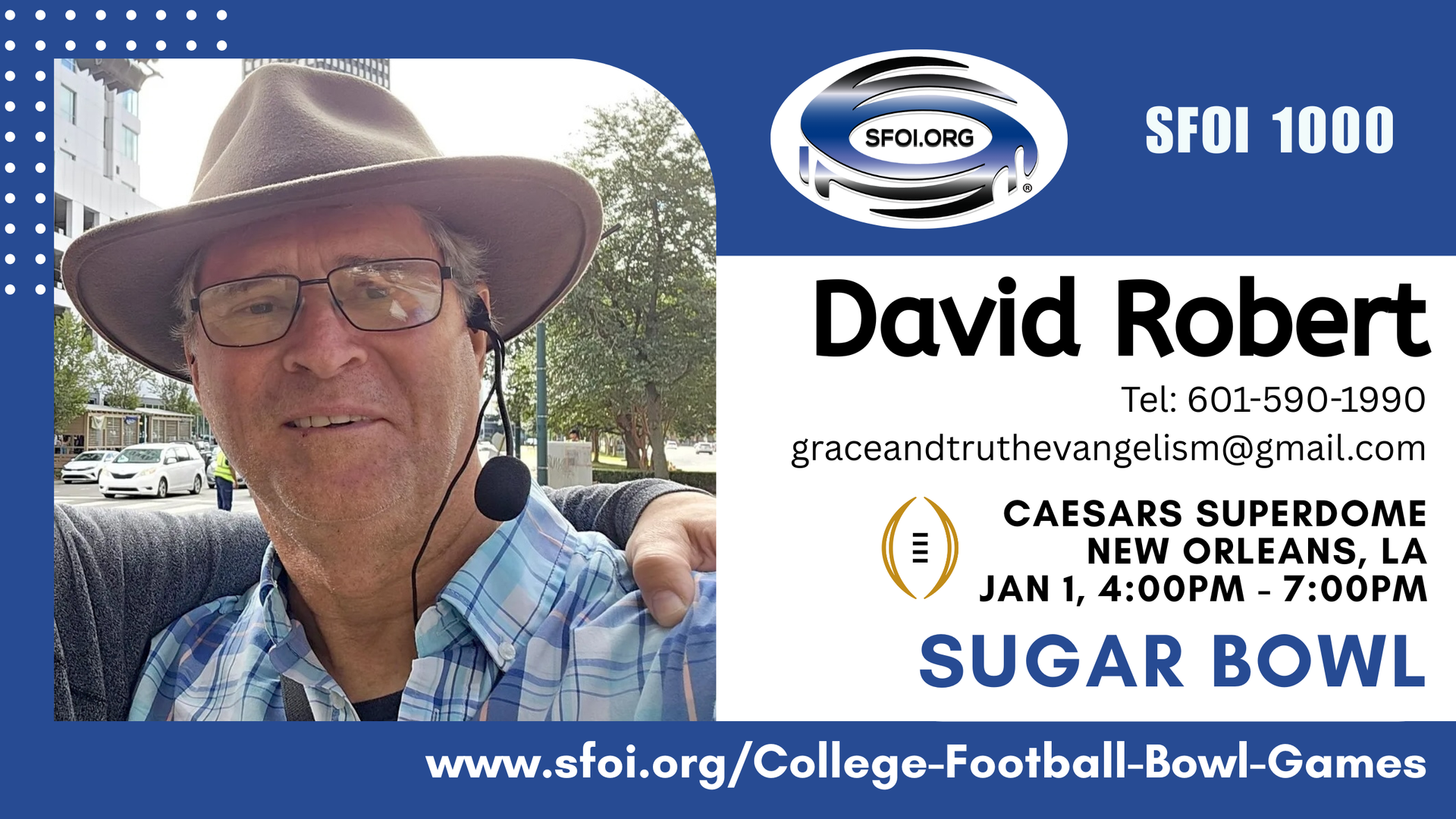 In 2010 the Lord allowed me to get cancer, and it was a blessing. I learned about biblical evangelism at that time, and life has not been the same. I am now a full-time evangelist, sharing the gospel of Jesus Christ door to door, at Mardi Gras parades, fairs and festivals, in the public schools, at Nicholls State University and Southeastern Louisiana University (taking an Acts 17 approach), and the New Orleans Saints games on Garot Street."