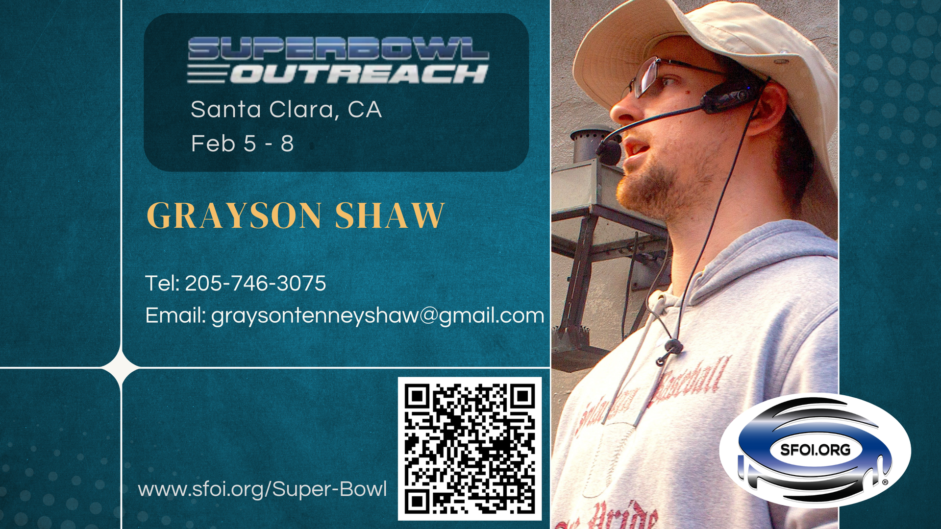 Grayson is a graduate of Georgia Southern and a Statesboro local. He has preached with SFOI at the 2024 Super Bowl in Las Vegas, as well as at the Boardwalk Chapel (Wildwood, NJ) and on the streets in Statesboro and Brunswick, GA. Grayson also lead the SFOI 1000 outreach team at the Georgia Southern University home football games.