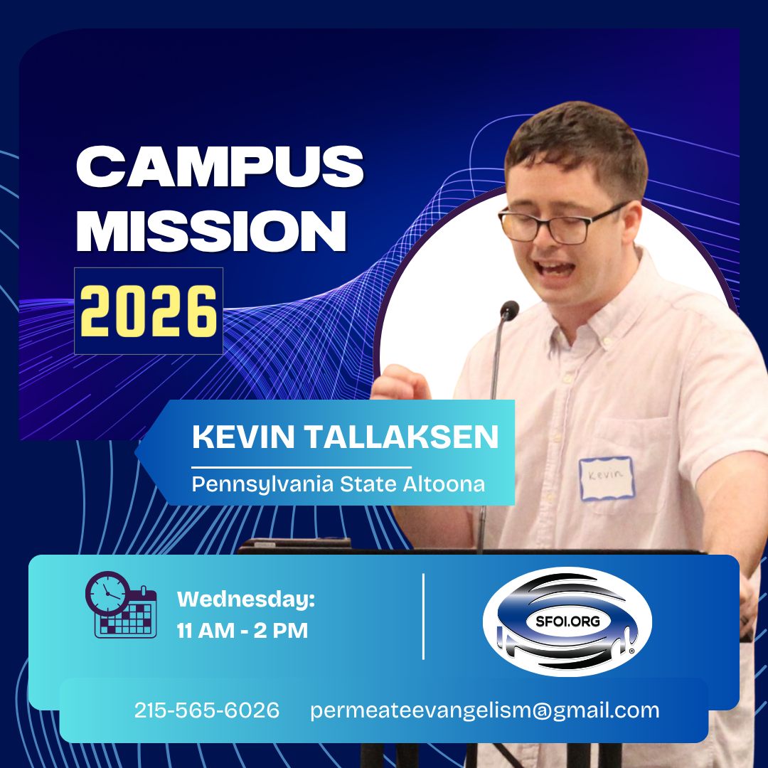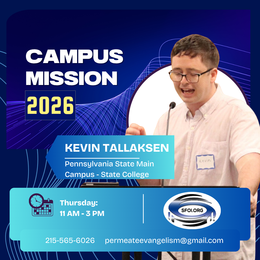 After living near Trenton, NJ for the last 14 years while going to school & working in the corporate world (International Logistics), Kevin now resides in Central PA (near the Penn State main campus) to move into full time ministry. Kevin is a full time missionary with Narrow Road Ministries & working on Permeate Evangelism. During the time in Central PA, he will be doing evangelism at Penn State football games and other events in the region. Kevin will also travel to do evangelism on various trips & events.