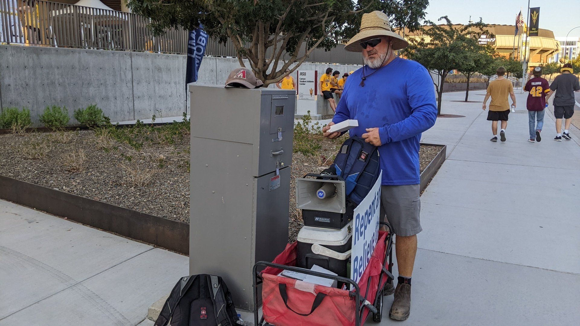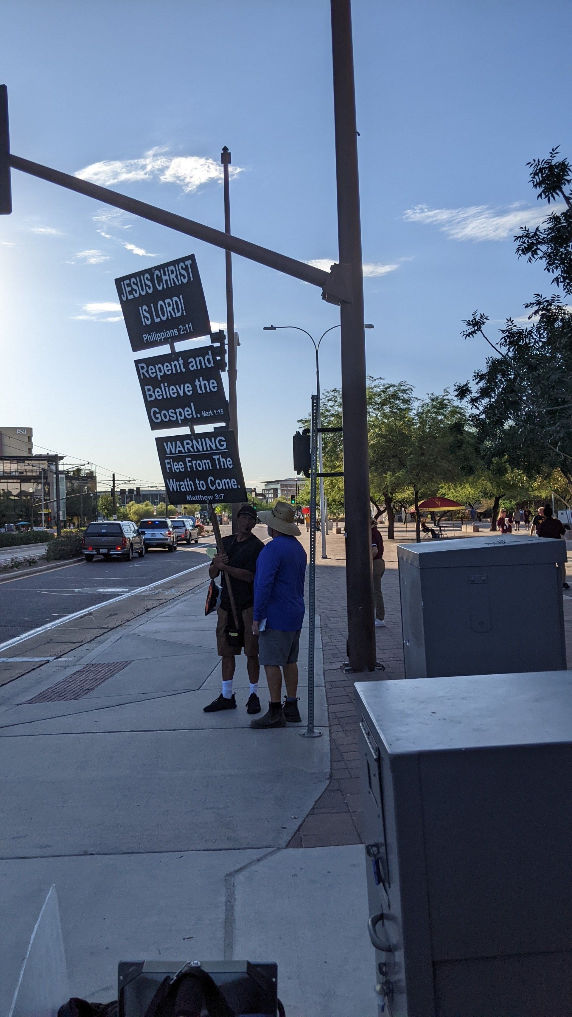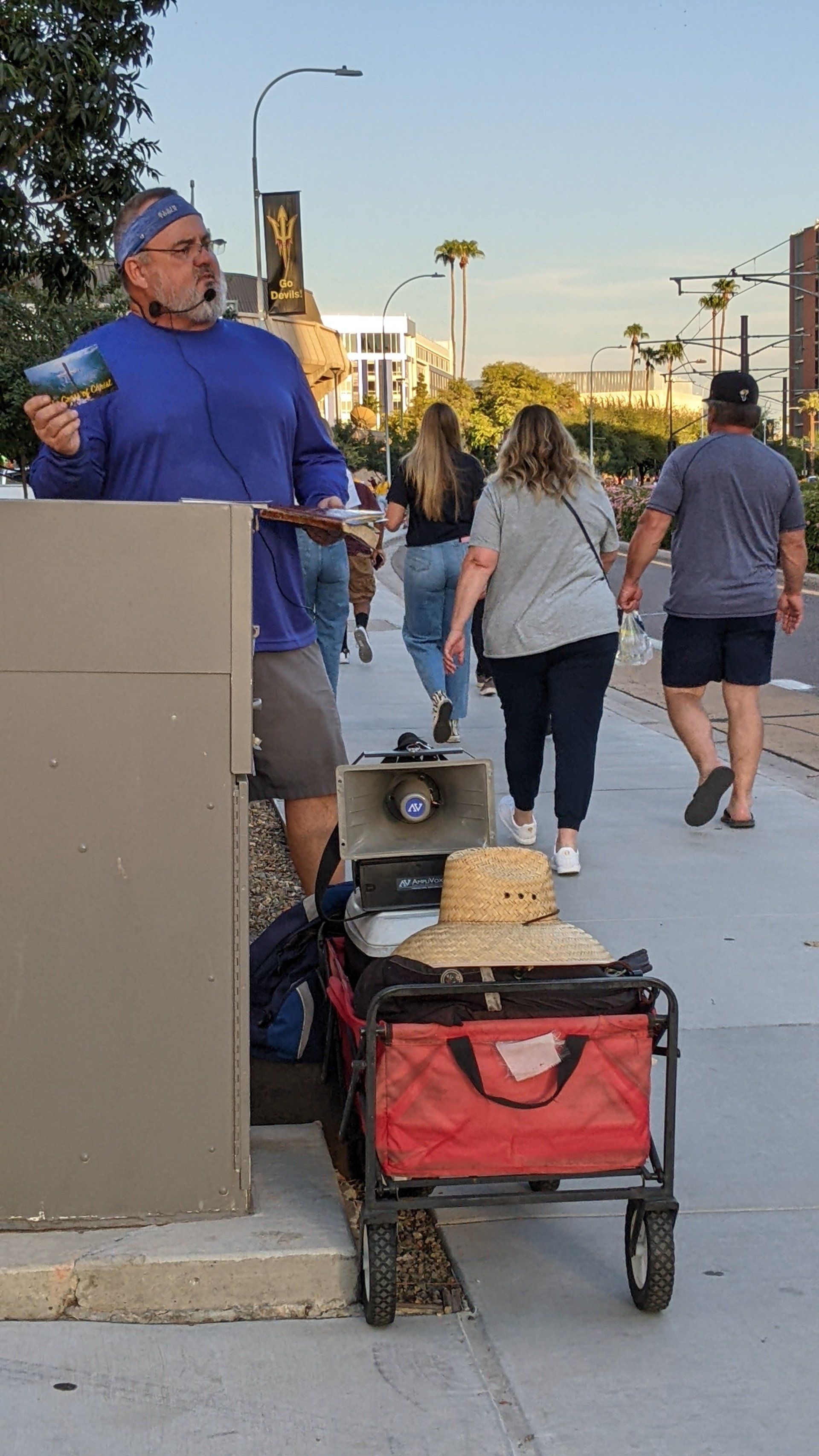 September 1 - Preached at the seasoner open for Arizona State University. Parked off campus and rode the light rail to the stadium. While on the light rail I was able to preach a little. Once we got to the stadium we set up at our usual spot at the south entrance. Mike Ford and I preached for almost a couple hours prior to the game until just after kickoff. The crowds were decent into the thousands. Had a number of hecklers but also some people who encouraged us. Was able to pass out some tracts and Gospels of Mark. Overall many heard the Gospel as they entered the stadium. One gentleman encouraged us saying that he has seen us out there for years and to keep up the good work. Praise the Lord!