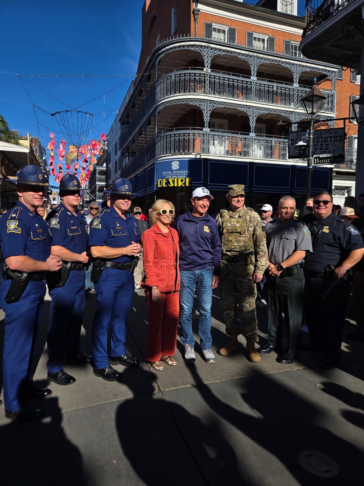 From our location on Bourbon Street, state police escorted Governor Jeff Landry to within 10 feet from us for photos. Utilizing a loud speaker, the Governor heard the gospel preached to him.