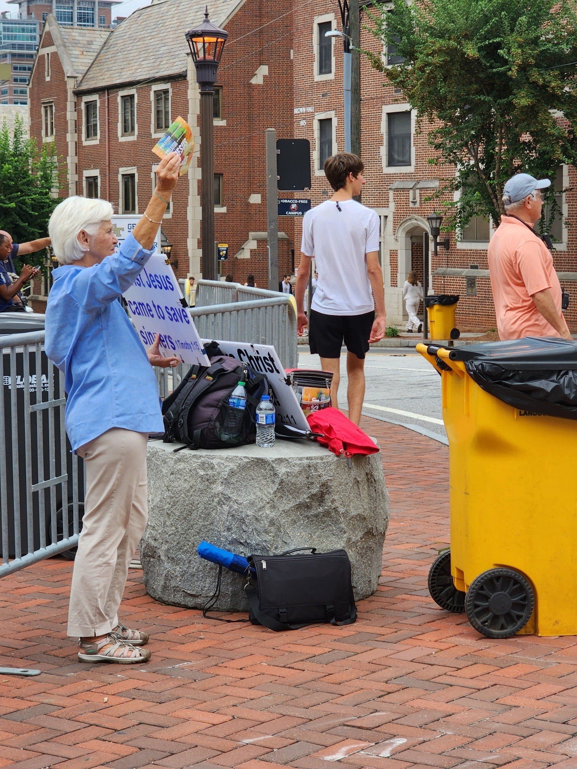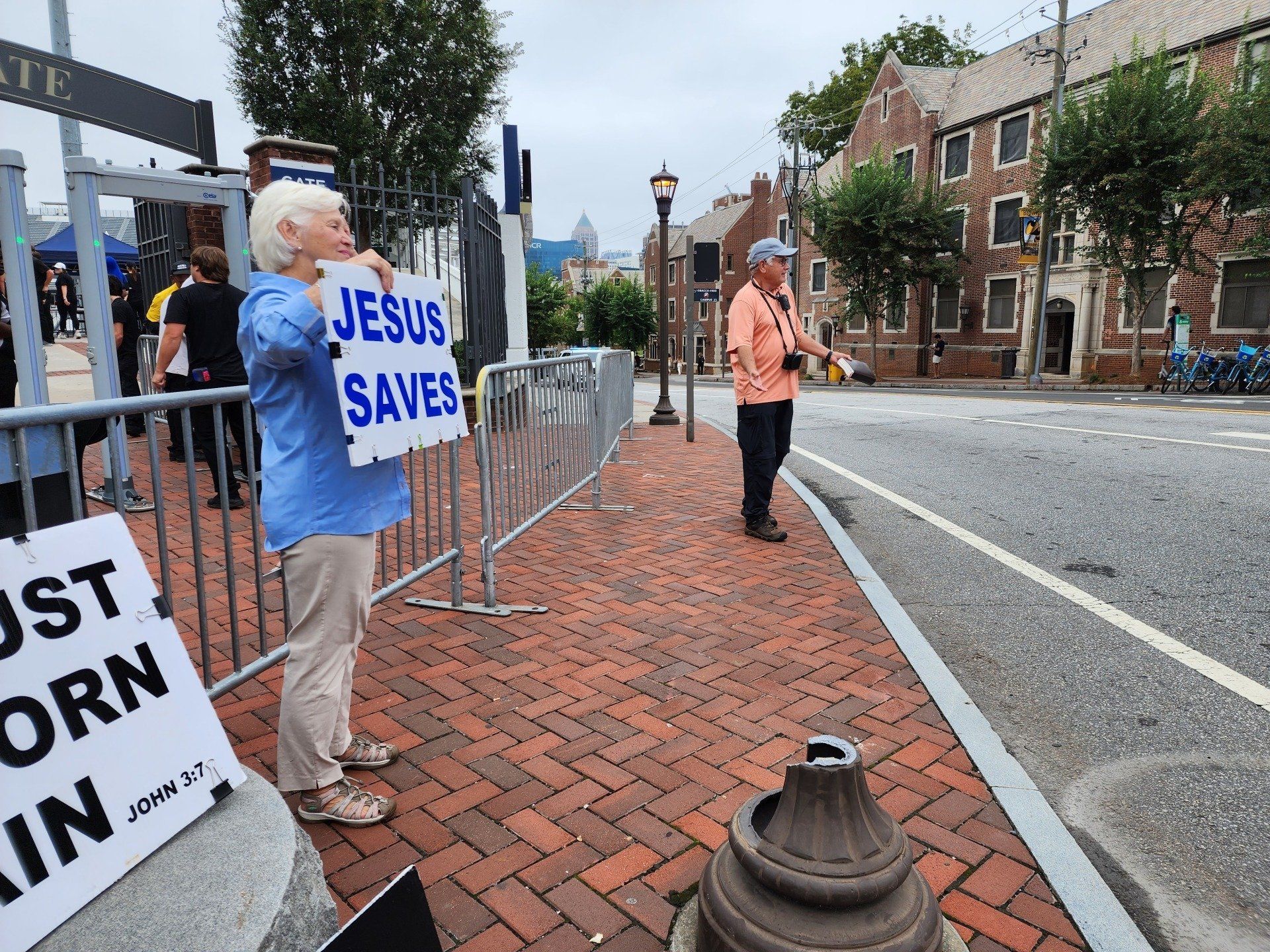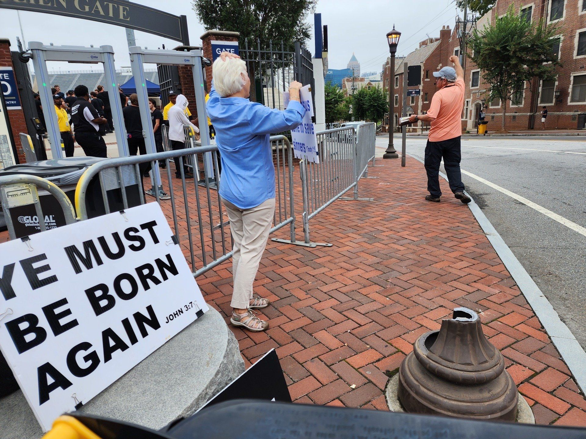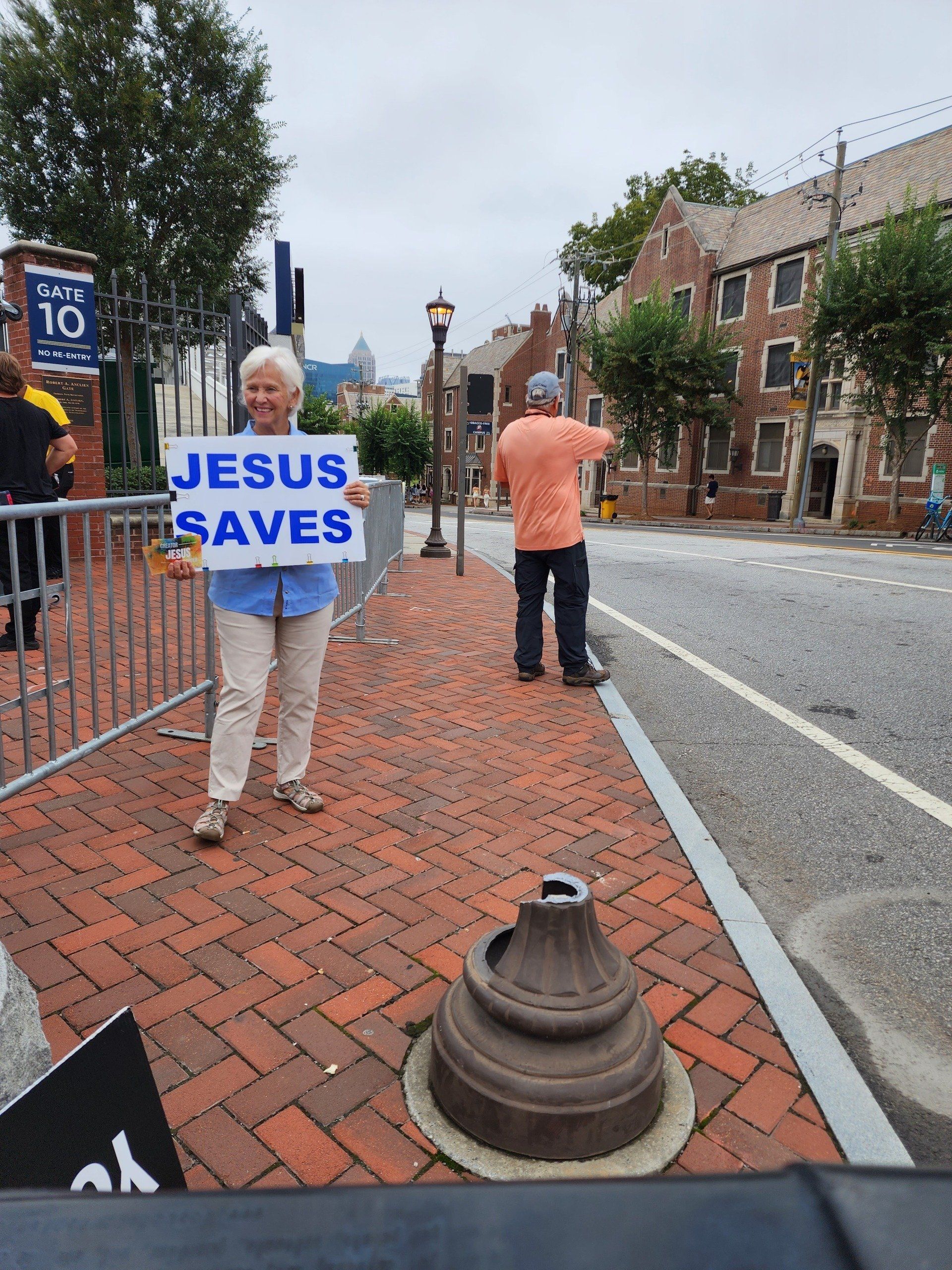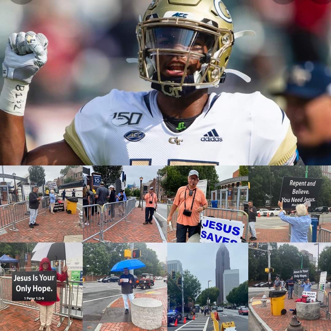 9/10 - So we begin this Saturday with wet and rainy afternoon at the Georgia Tech Yellow Jackets Stadium. Preaching the Gospel the Good News to the amazement of students and many lookers. Stirling and Carl Long were also joining us at the corner of the Bobby Dodd Stadium outside Gate 10. We both took turns preaching for about 2 hours and passing out gospel tracts to passers by as well. We had some opposition with the Georgia Tech security guards asking us to move off the public sidewalk, but we kindly stood our ground and continued to proclaim the glorious gospel of Jesus Christ. “Who has believed what he has heard from us? And to whom has the arm of the Lord been revealed?” Isaiah 53:1 ESV