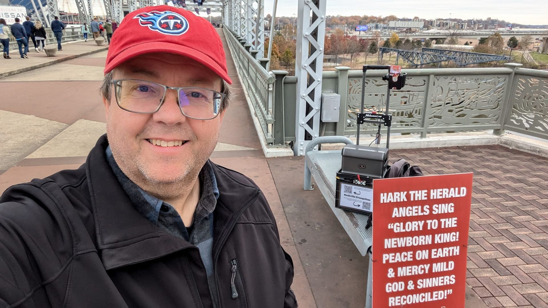 We had three teams of evangelists on the pedestrian bridge for the Music City Bowl.