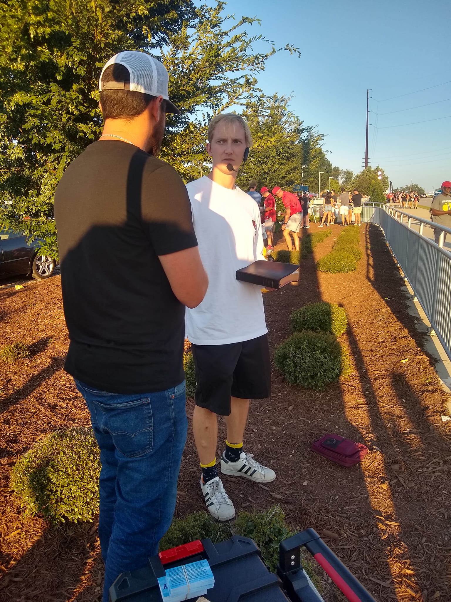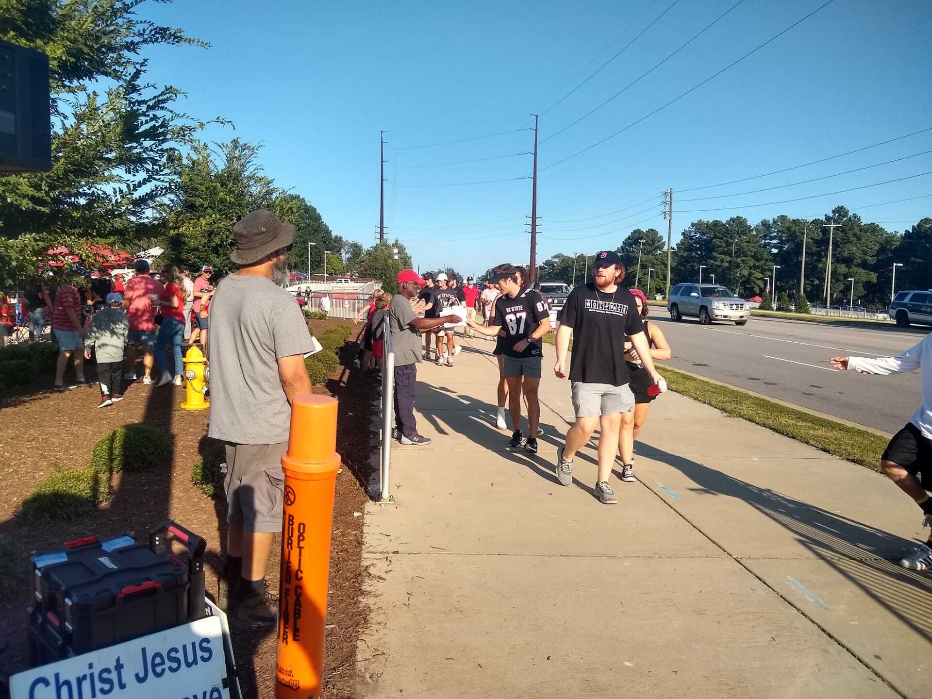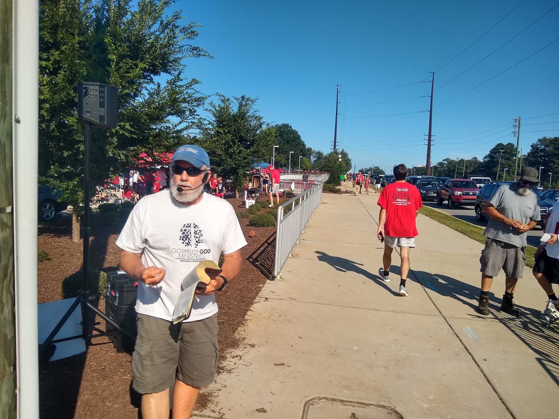 Many hear the gospel at the NC State game today. We had a team of five men preaching at the NC State football game this past weekend. We passed out about 600 gospel tracts and had a few conversations. The team members consisted of Kevin Creasy, Peter Firth, Daniel Springs, Joseph Toy and Michael Seethaler.