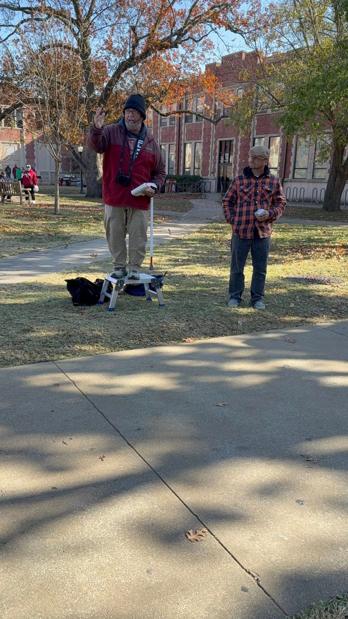 It was just me today. I arrived at Gaylord Family/OU Memorial Stadium at 0900 and started preaching. I went live outside Campus Corner for a time and attempted to go live at the stadium, but the signal was blocked. I preached Matthew 4:1-2, Exodus 16:2-20, Habakuk 2:4, Genesis 7:7-16, and Daniel 3:1-7.
