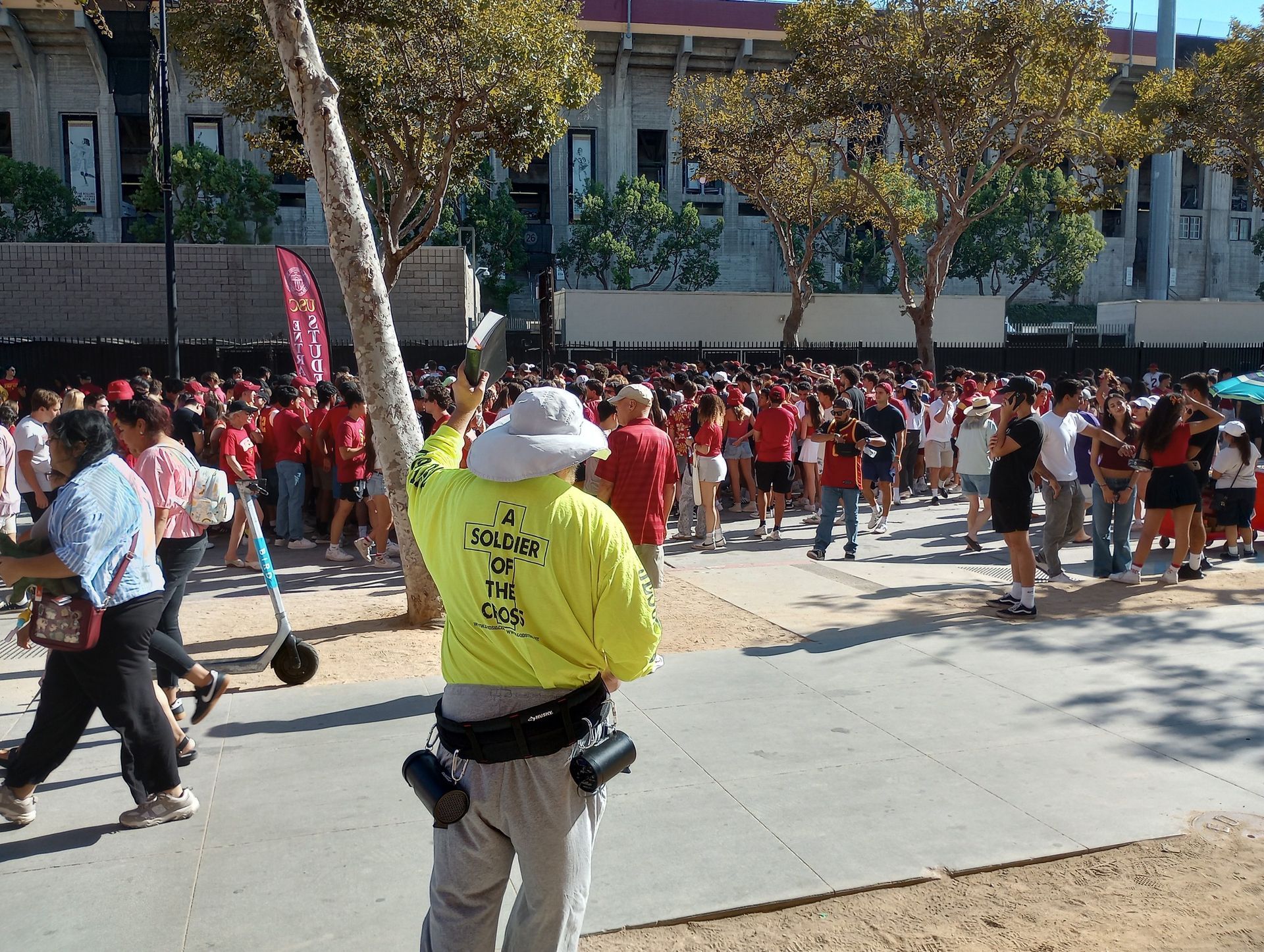We were preaching at the University of Southern California to huge crowds. The week before, we had a pastor rebuke us for open air preaching. This week, we had an amazing Divine appointment. A man named Nick took a tract, sat down nearby and read it, then approached us with questions. It's clear the Holy Spirit was at work in his heart. He struggled with drunkenness and the simplicity of faith in Christ. The amazing part is that when we arrived at the stadium, we realized we forgot our tracts. We got some tracts from another person from our church. They were different from the ones we brought. The tracts we had were "This Was Your Life" and "How Men Come to Christ." Both deal with the topics that Nick struggled with. Had we brought our tracts, he wouldn't have received those. God overruled our plans with forgetfulness because He knew what Nick needed.
