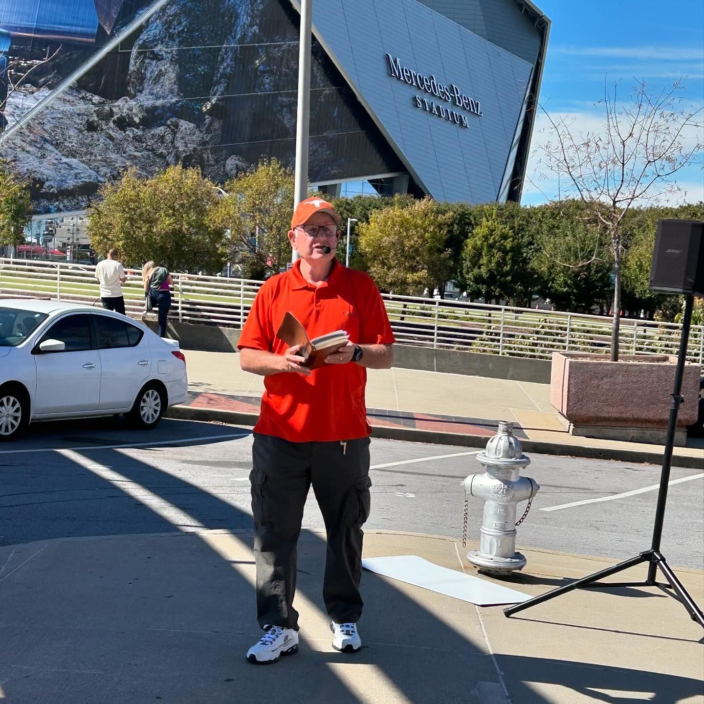 While hundreds of fans flooded the sidewalks headed towards the Mercedes Benz Stadium, a bright light shone over one corner as the Gospel was proclaimed telling the fans of the glorious work of Jesus Christ. Today there were very few mockers and scoffers and both Carol and I had amazing Christ centered conversations with a number of people. “He was in the world, and the world was created through Him, yet the world did not recognize Him. He came to His own, and His own people did not receive Him.” - John 1:10-11 HCSB