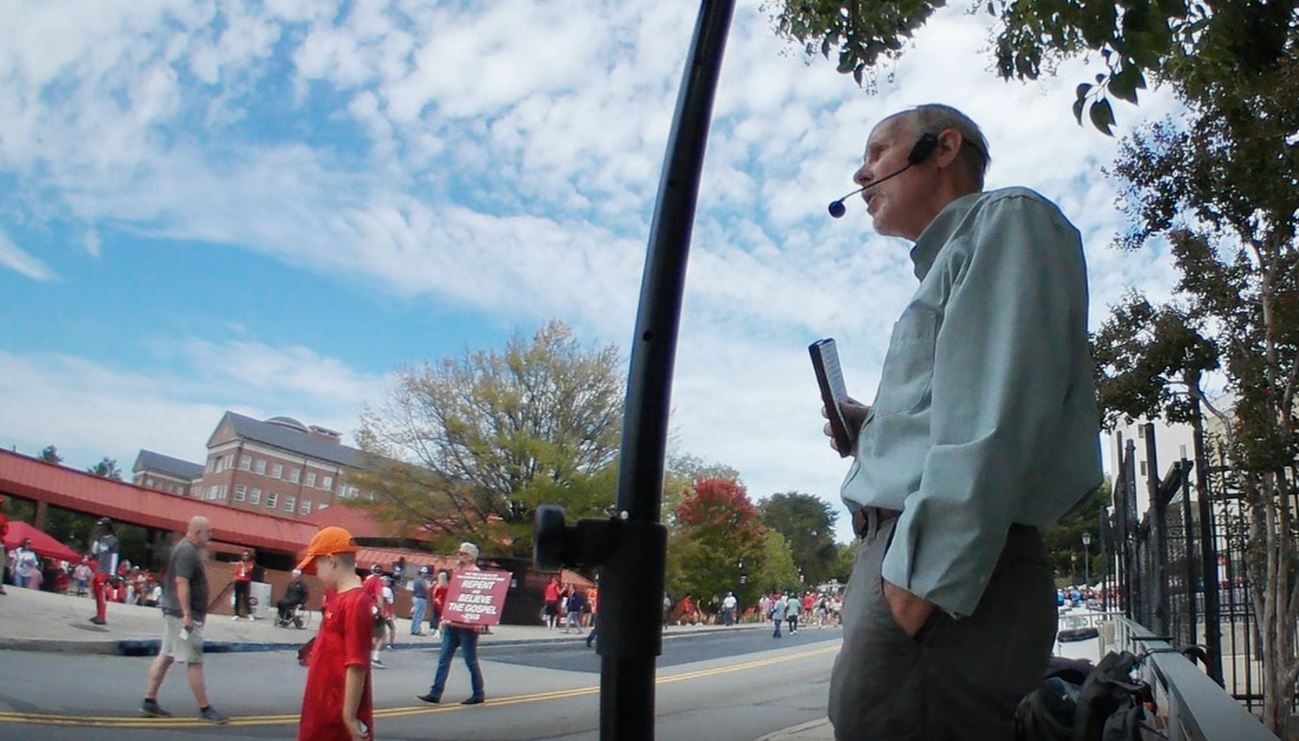 Dennis began the preaching, followed by Scott and Rich, with me ending the day. As usual, with this crowd, we had those who were thankful we were there and those who were not so thankful. While one was preaching the others passed out tracts. As I was holding a sign that said “The time is fulfilled, the Kingdom of God is at hand, repent and believe the Gospel ~Jesus,” I was told I was #1 with the middle finger and one guy yelled, “Go Home!” Several others came by intentionally bumping into me or pushing my sign away as they passed by, some even turned and gave me snarky looks after pushing by me while pushing away the sign. Bear in mind, I wasn’t saying anything but was simply holding a sign with a direct quote from Jesus. At one point an older gentleman, I will refer to as “Captain Obvious”, looked at my sign and said, “We’re going to a football game.” I assume he was saying we should not have been there, or I guess he may have thought we were at the wrong venue. :)