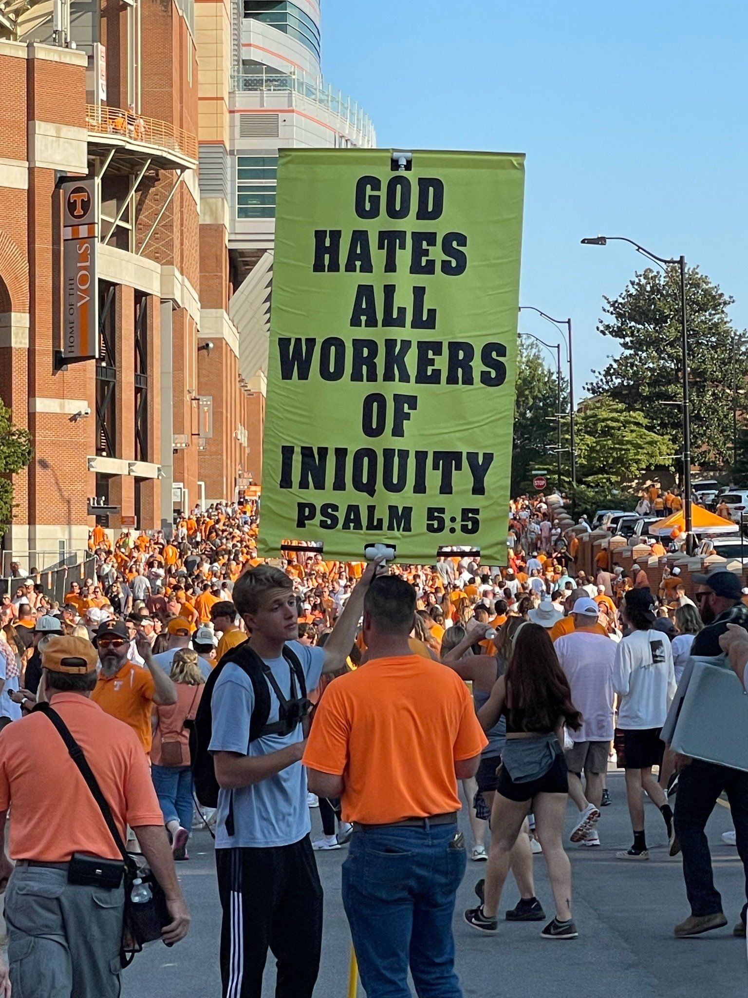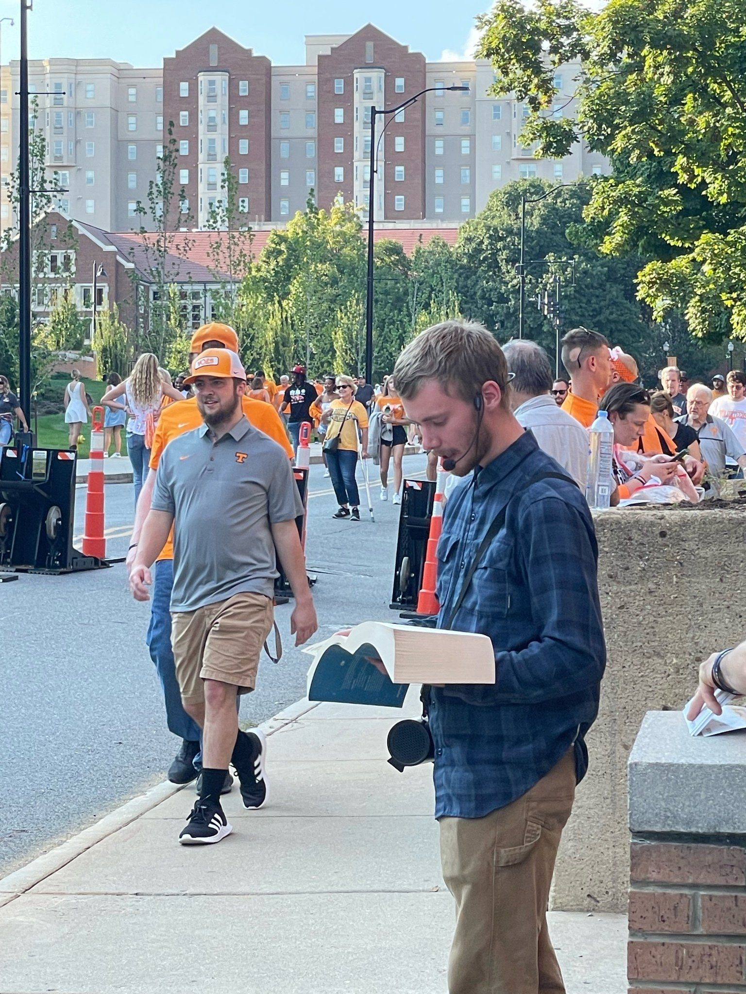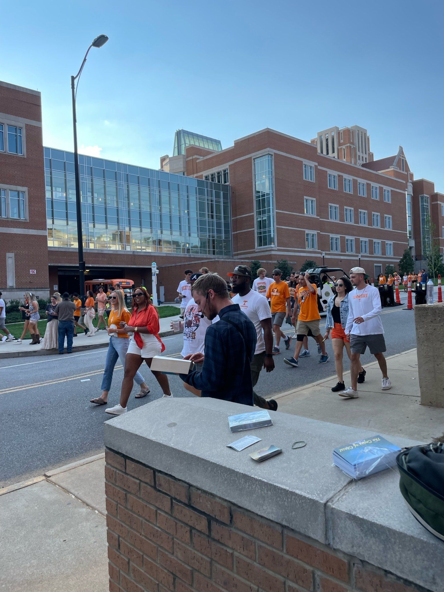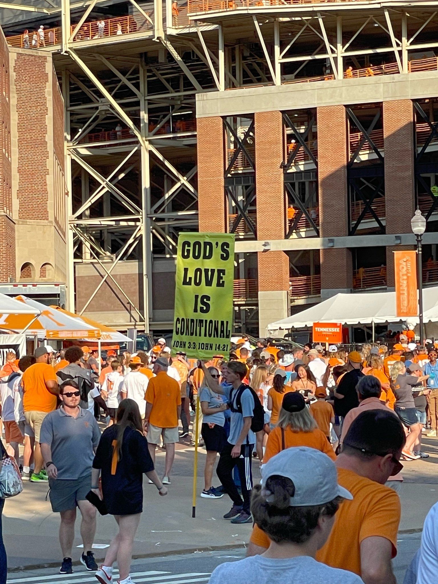 9/17 - Saturday's UT outreach was outstanding! First, Wendell Shrock brought 4 of his children with him; Wendell's friends Tony and then Matt joined us and another of their friends who was witnessing to the fans individually stopped by and lastly Aaron, at the game by himself, joined us. In all a total of 11 evangelists were at the game.