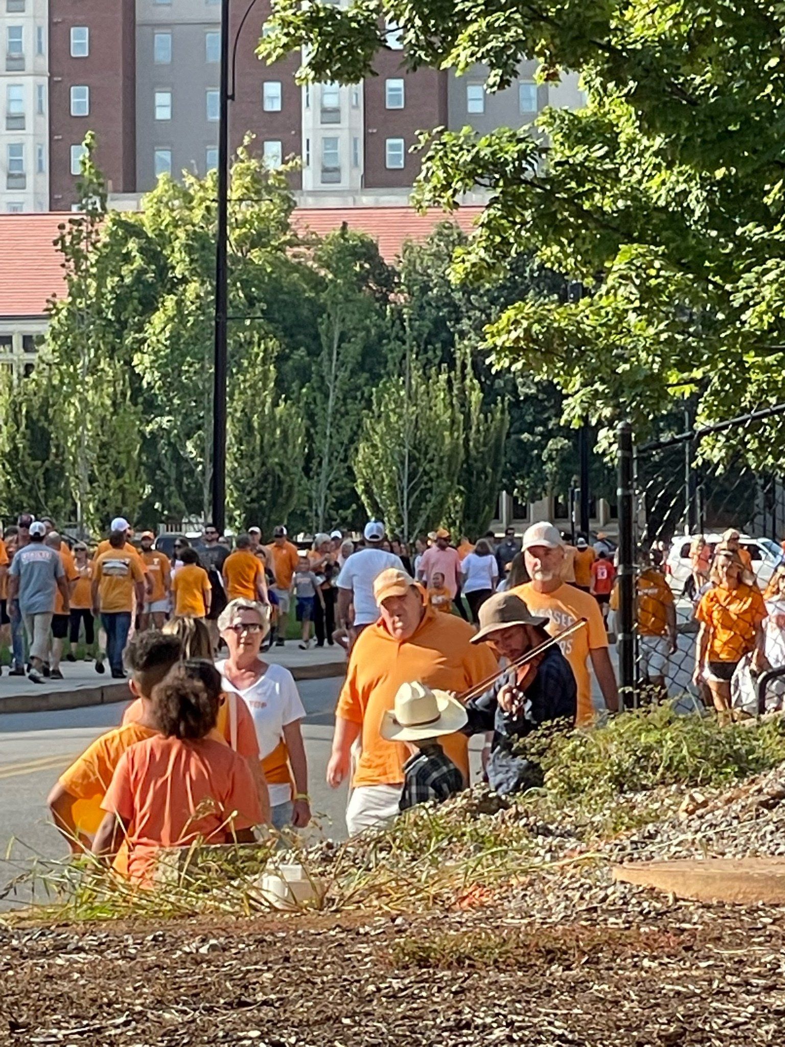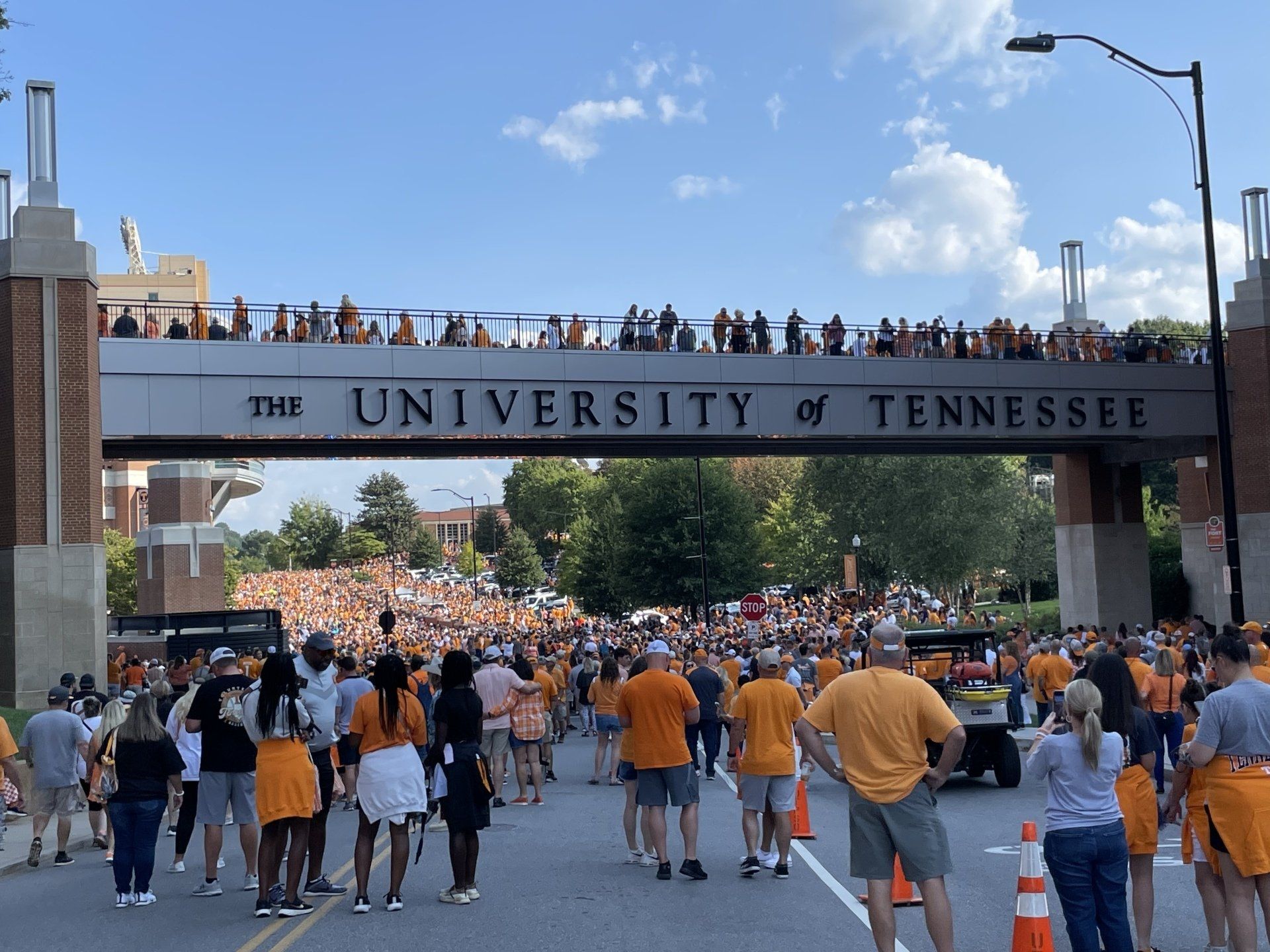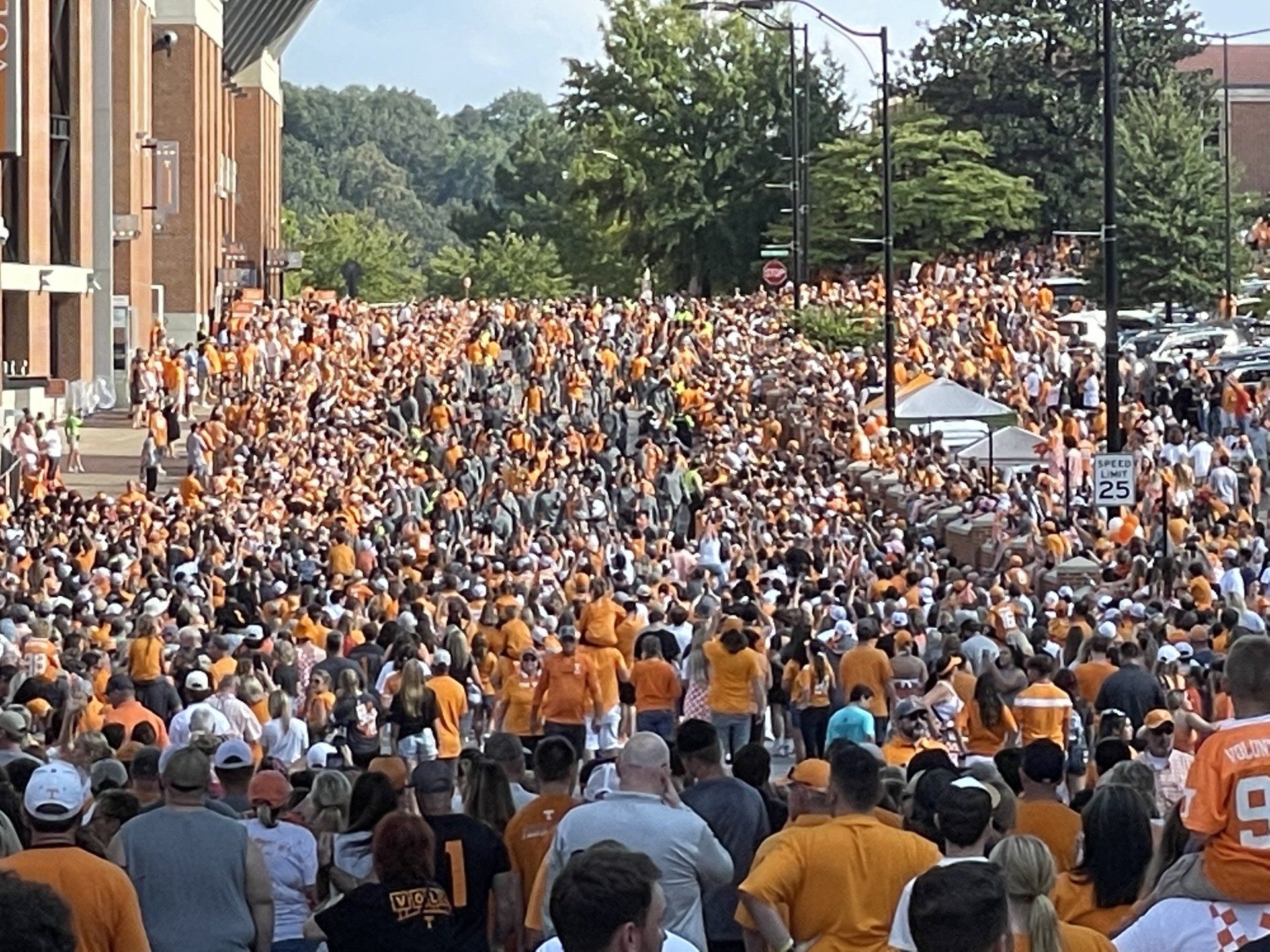 9/17 - Saturday's UT outreach was outstanding! First, Wendell Shrock brought 4 of his children with him; Wendell's friends Tony and then Matt joined us and another of their friends who was witnessing to the fans individually stopped by and lastly Aaron, at the game by himself, joined us. In all a total of 11 evangelists were at the game.