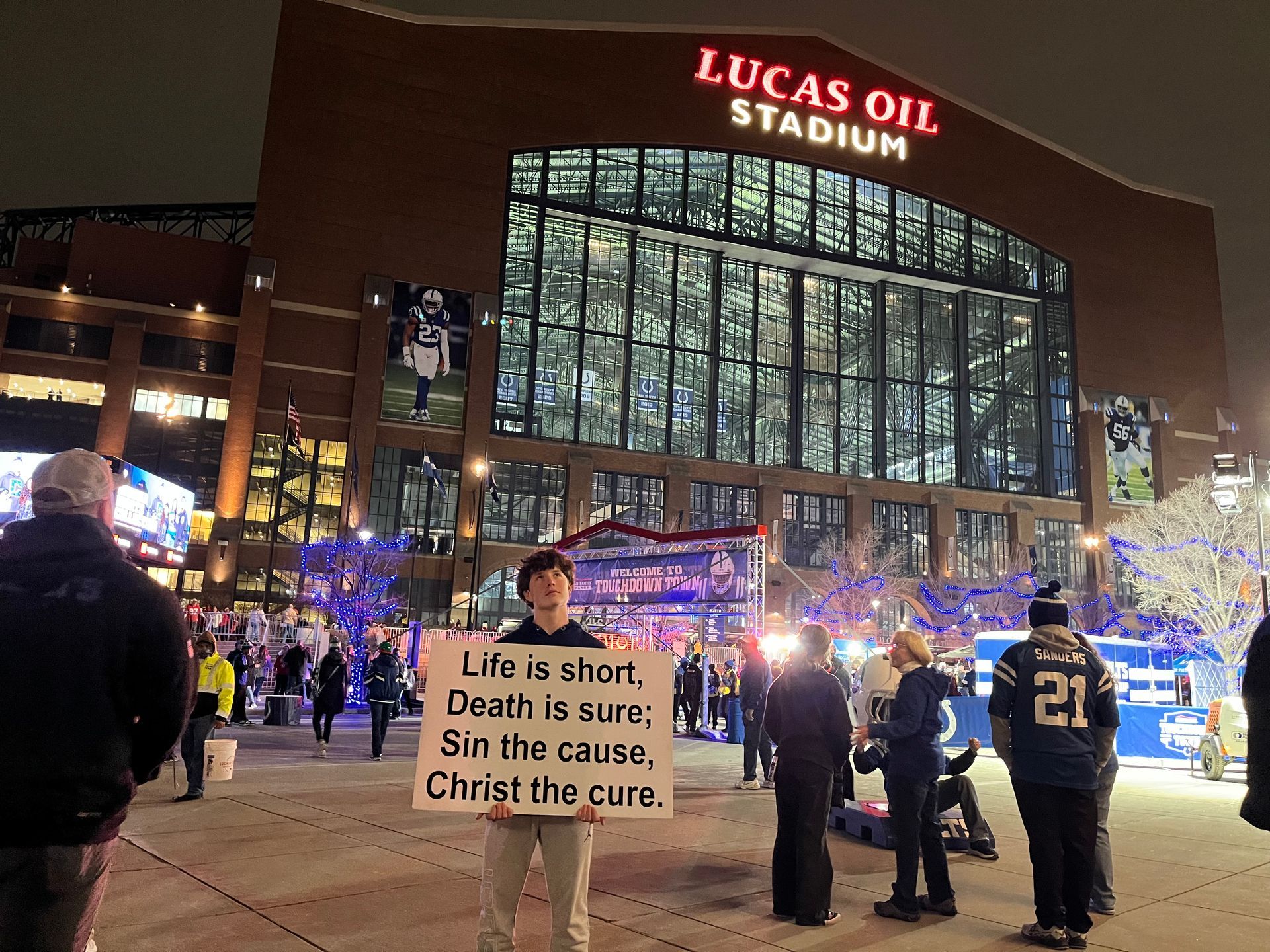 Fabulous night of Cornerstone Bible Church Evangelism Outreach at Lucas Oil Stadium last night. Gospel Proclaimed, Tracts handed out, fellowship had, discipleship attained, and preached the True Meaning of Christmas…Jesus Christ!!! “She will bear a son, and you shall call his name Jesus, for he will save his people from their sins.” -Matthew 1:21 ESV