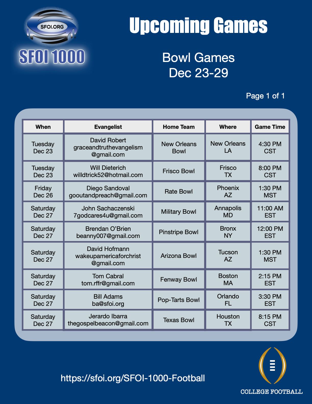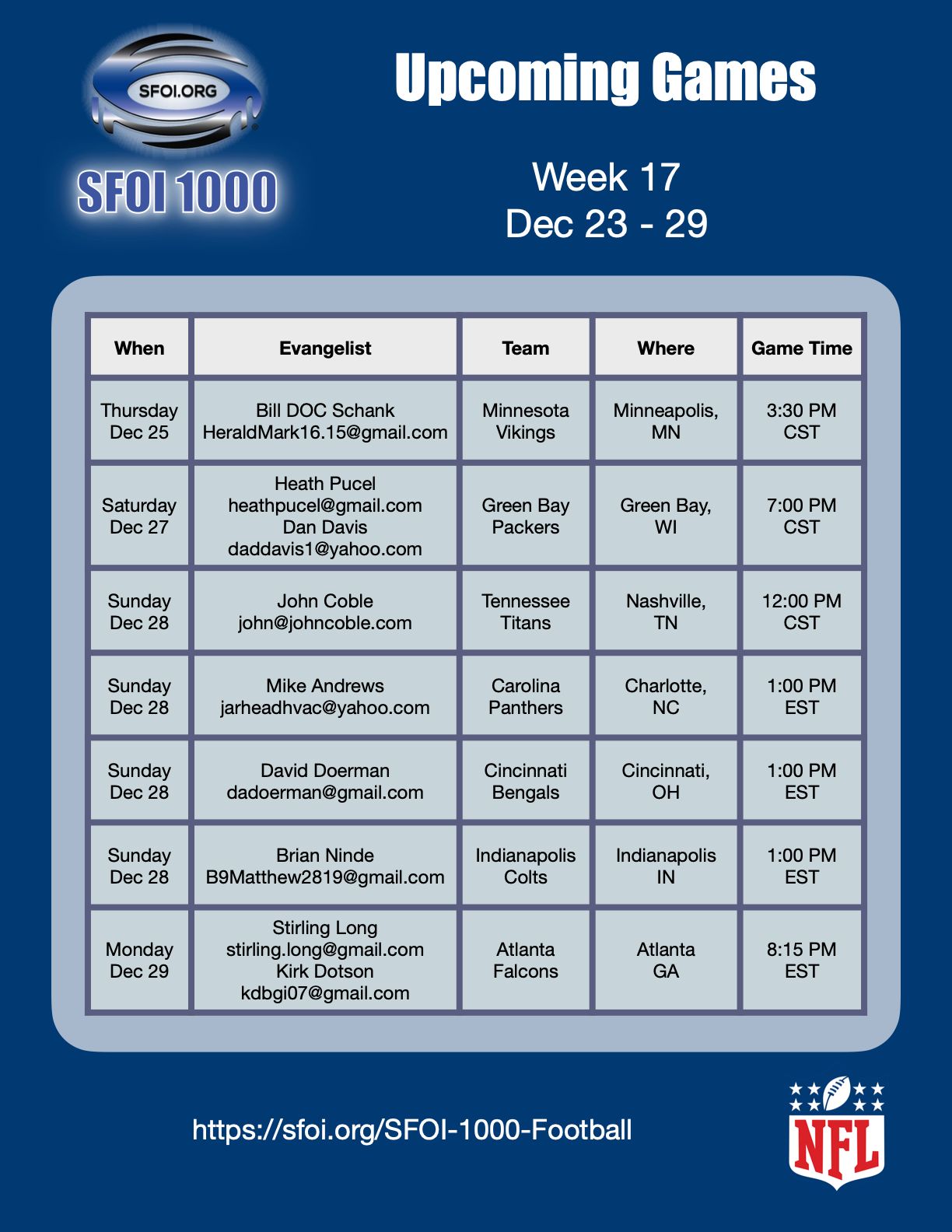 Herewith the schedule for the upcoming home game outreaches (Dec 22 - 28), as well as some feedback from evangelists that reached out last week (Dec 15 - 21)