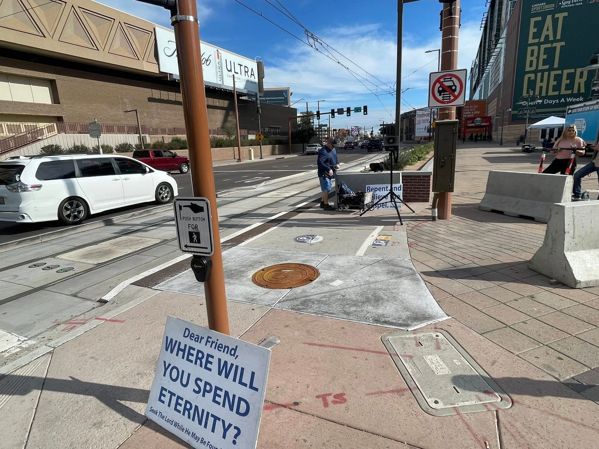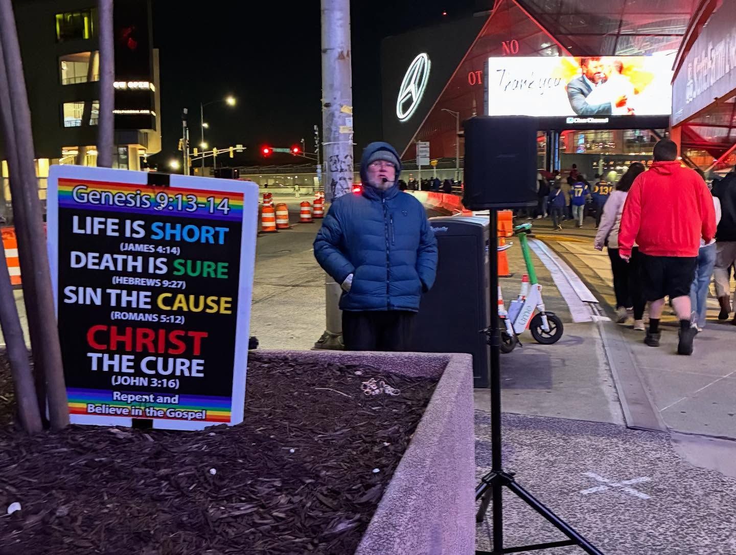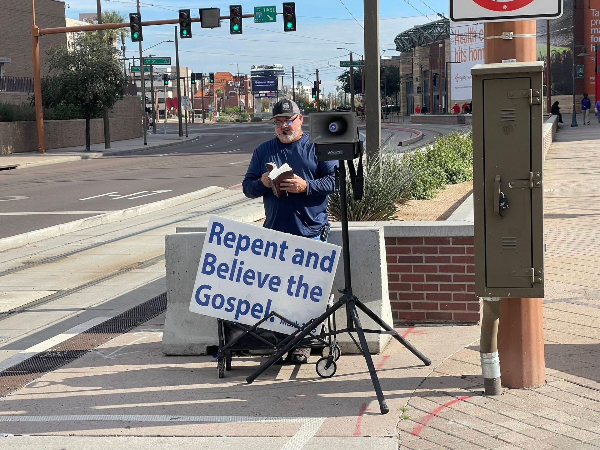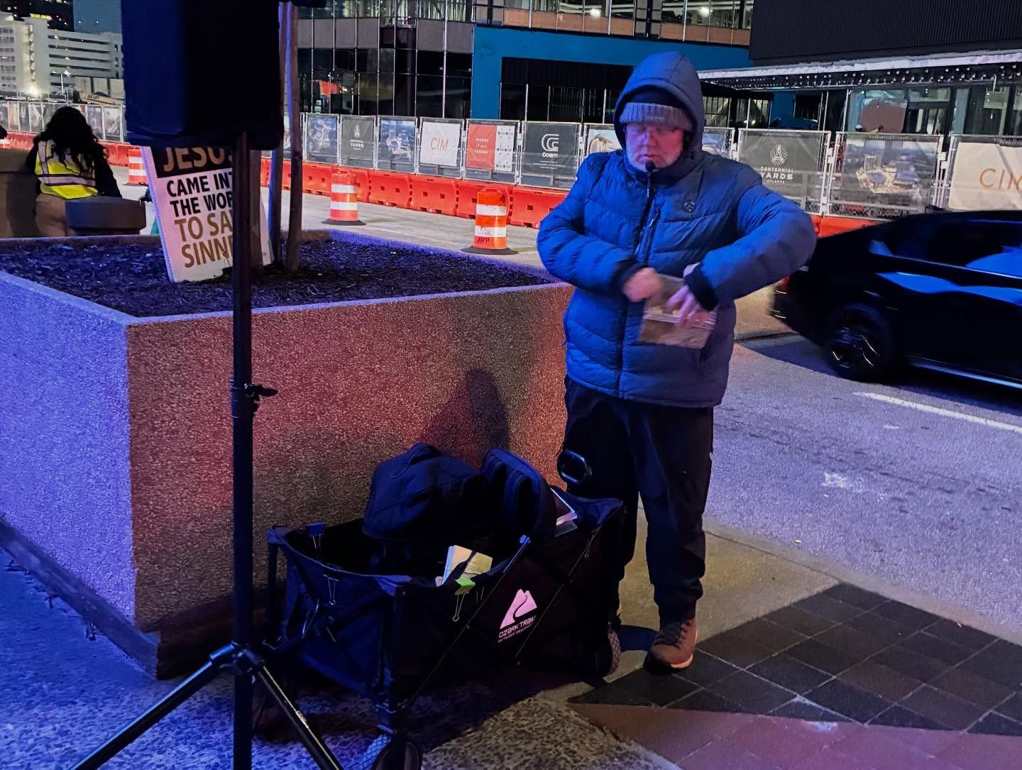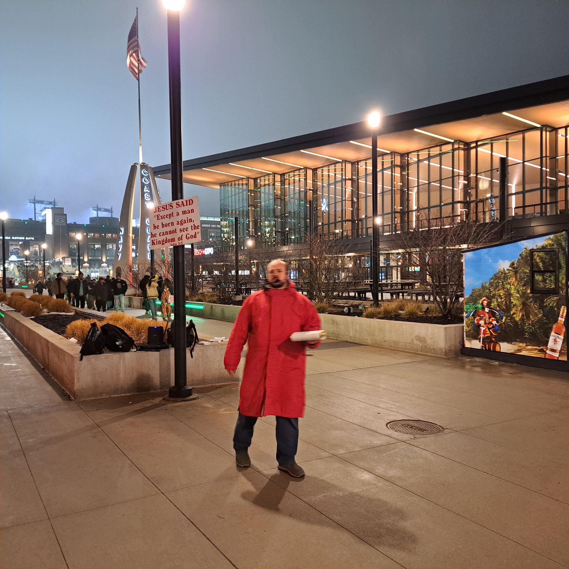 A windchill factor feeling like 19 degrees blew over the masses of Falcons & LA Ram Fans as we distributed hundreds of Gospel tracts and proclaimed His Glorious Gospel. Great preaching on a cold windy winters night at the Falcons vs LA Rams NFL Game.