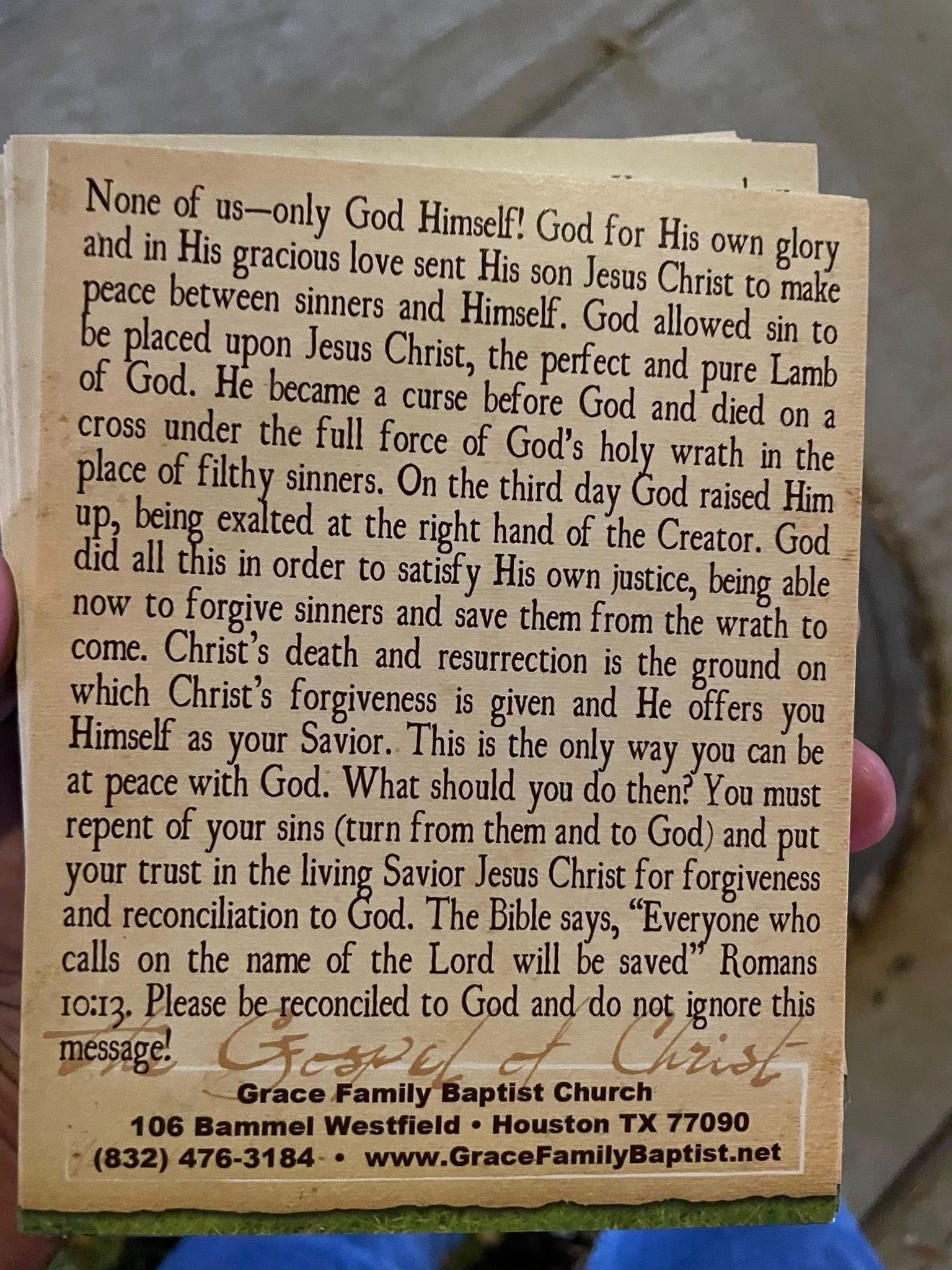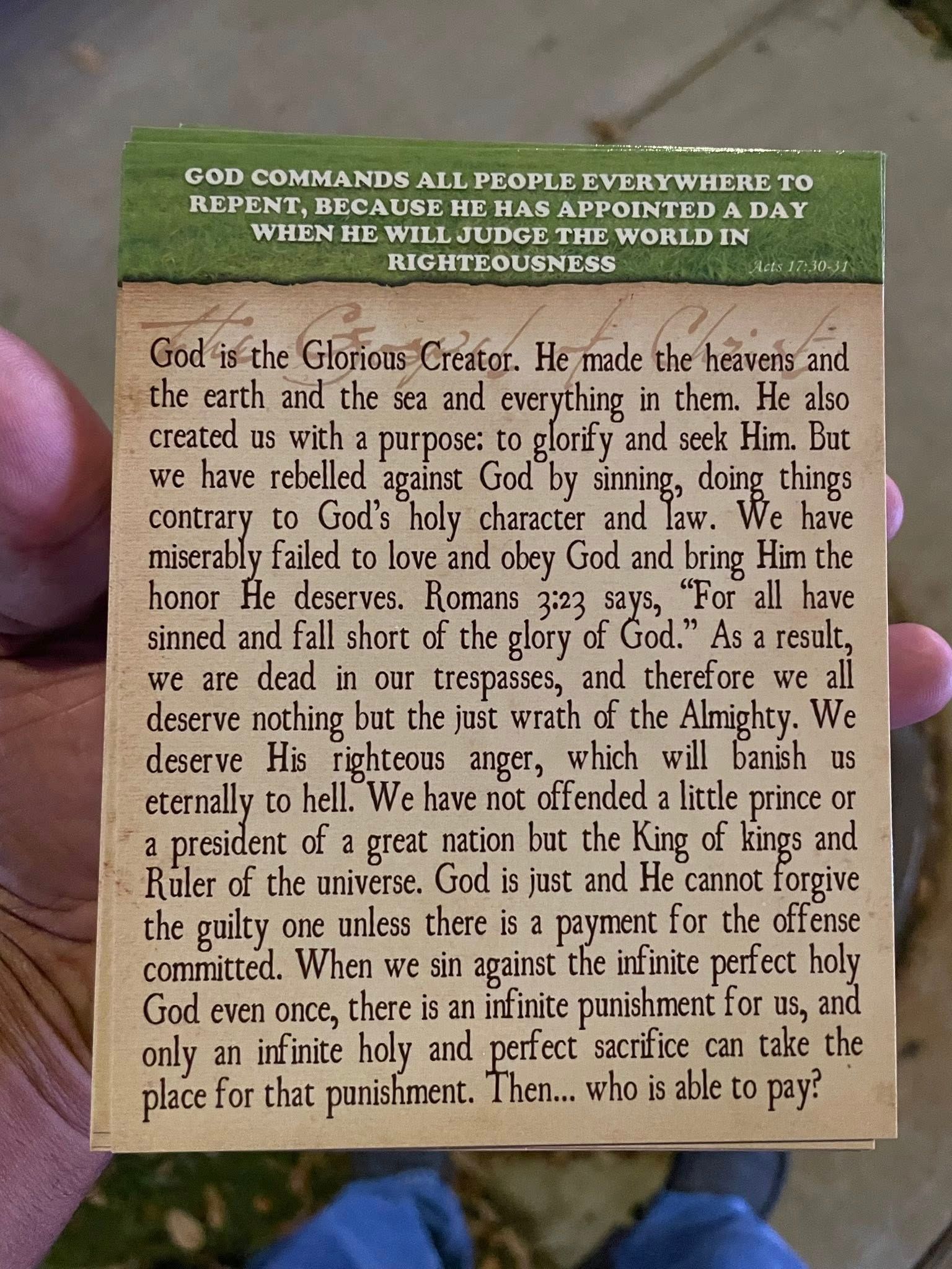 Gospel proclaimed, Tracts handed out, fellowship had, & God glorified.