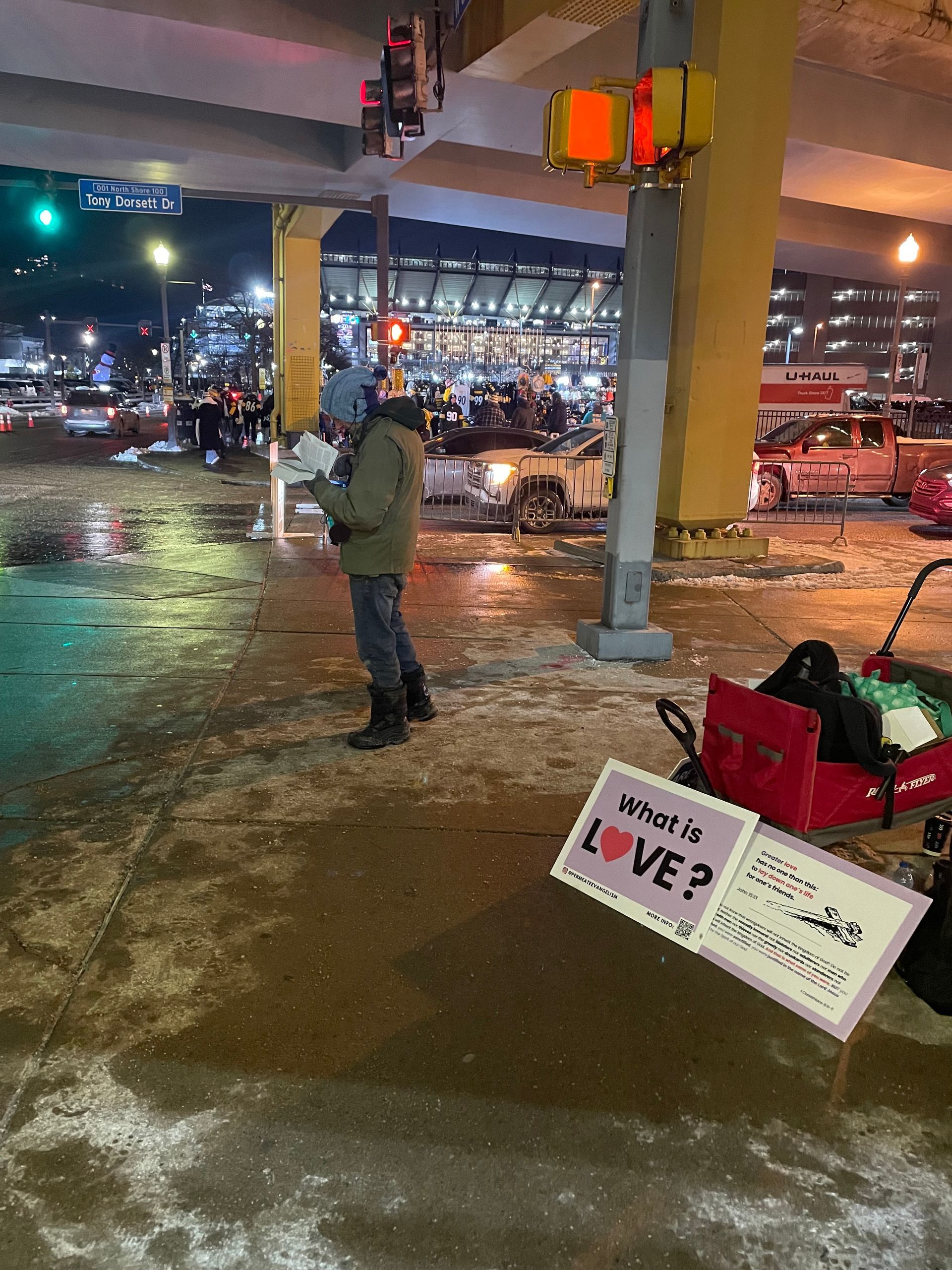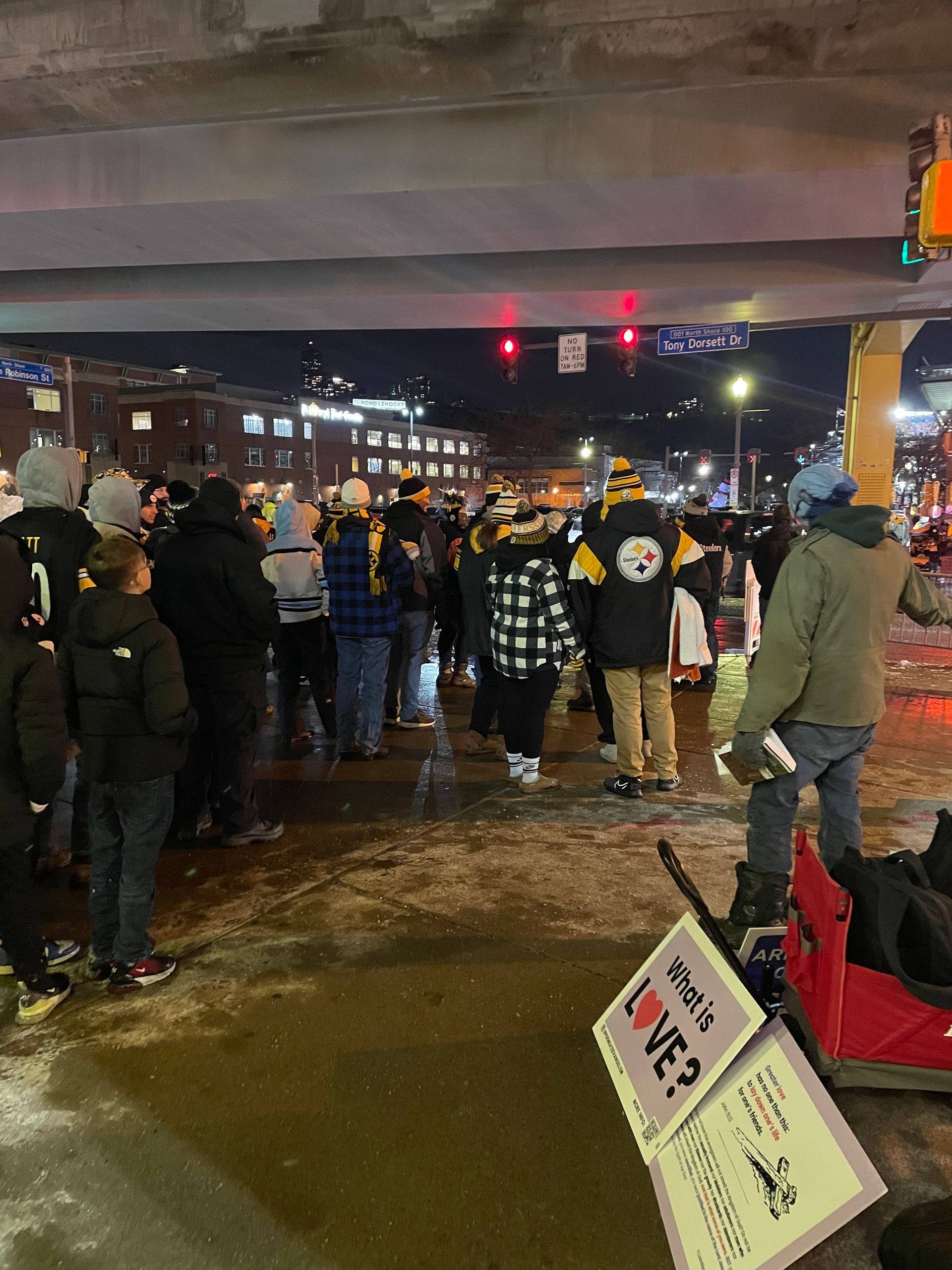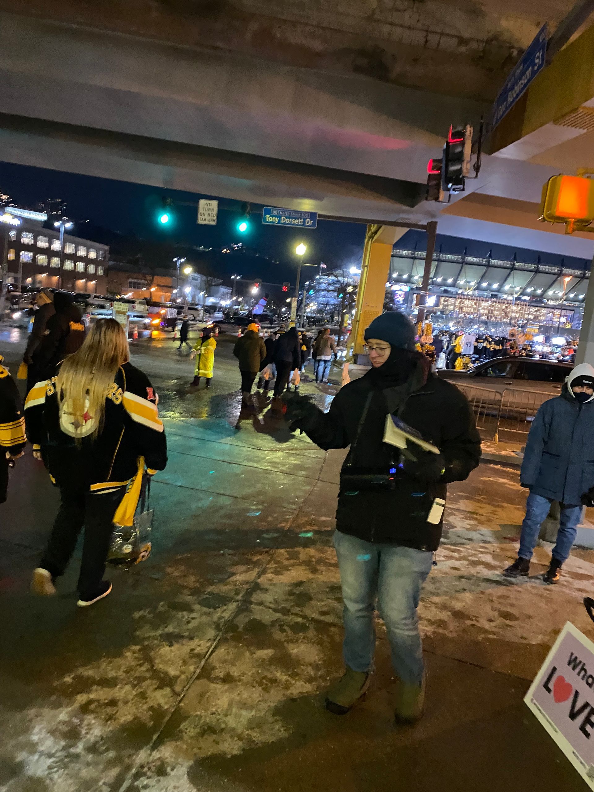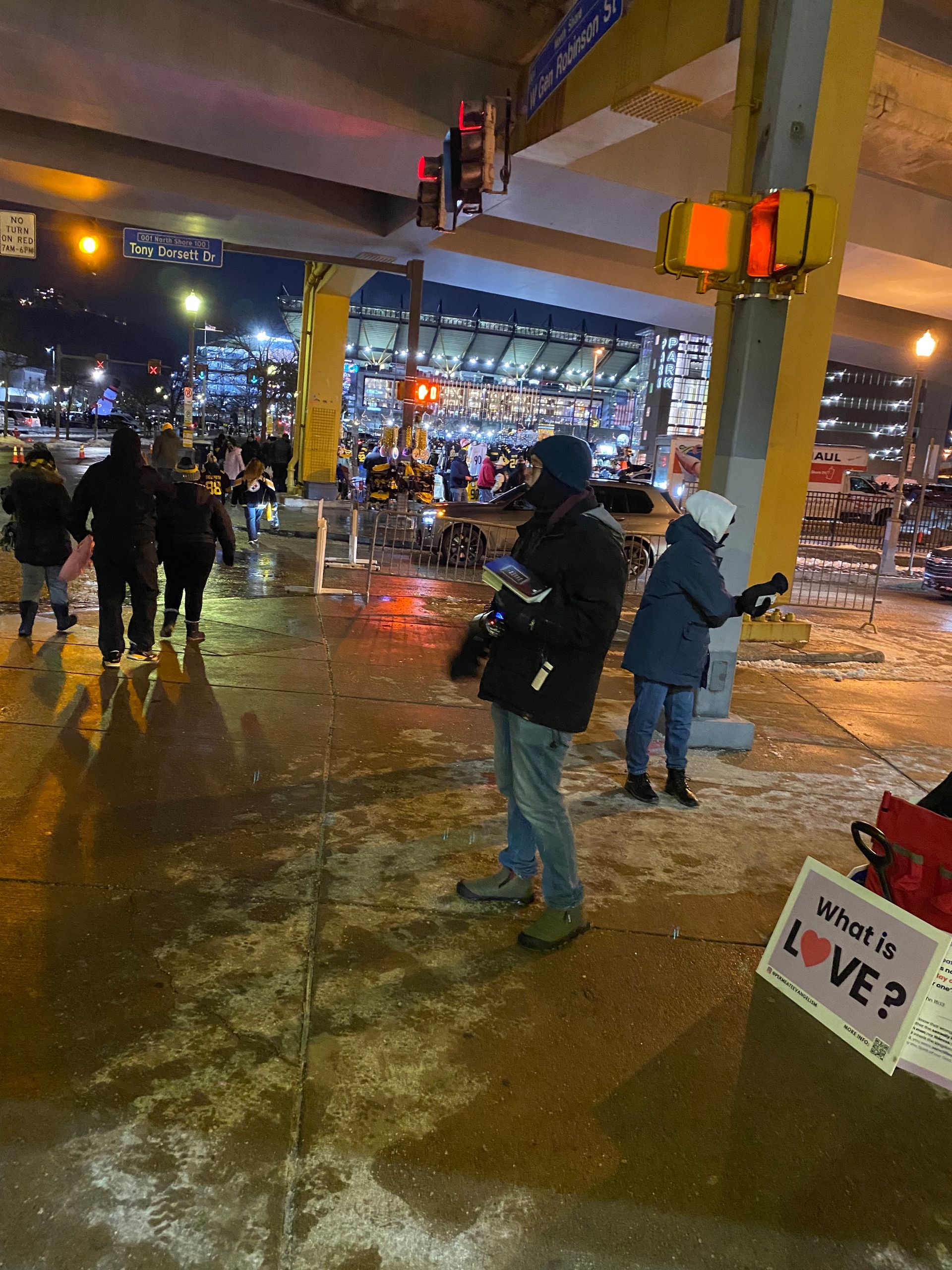 It was the coldest day of outreach all season for a Steeler game yet, for the first time, I had two other evangelists join me, and we probably handed out about 80 gospel tracks maybe less, but we were able to preach from Colossians chapter 1, John chapter 3, and Luke 15. We had a few interactions. It was a good day of ministry despite the cold.