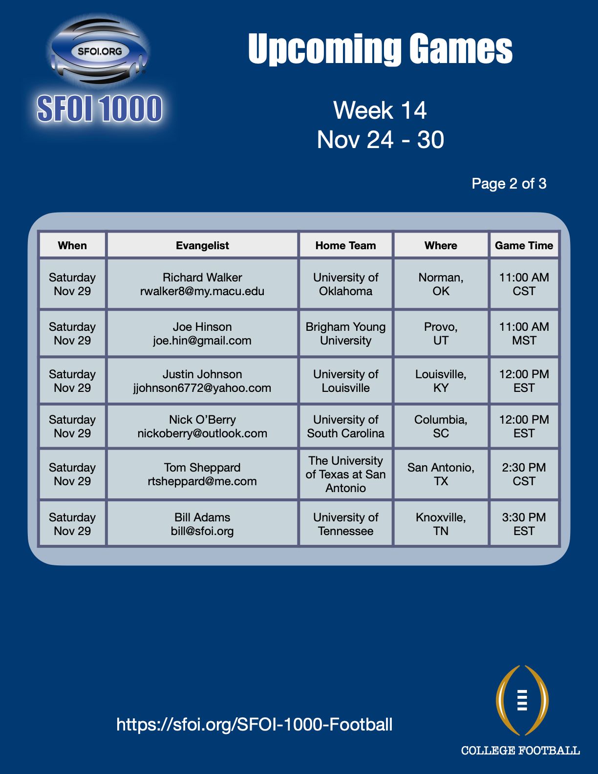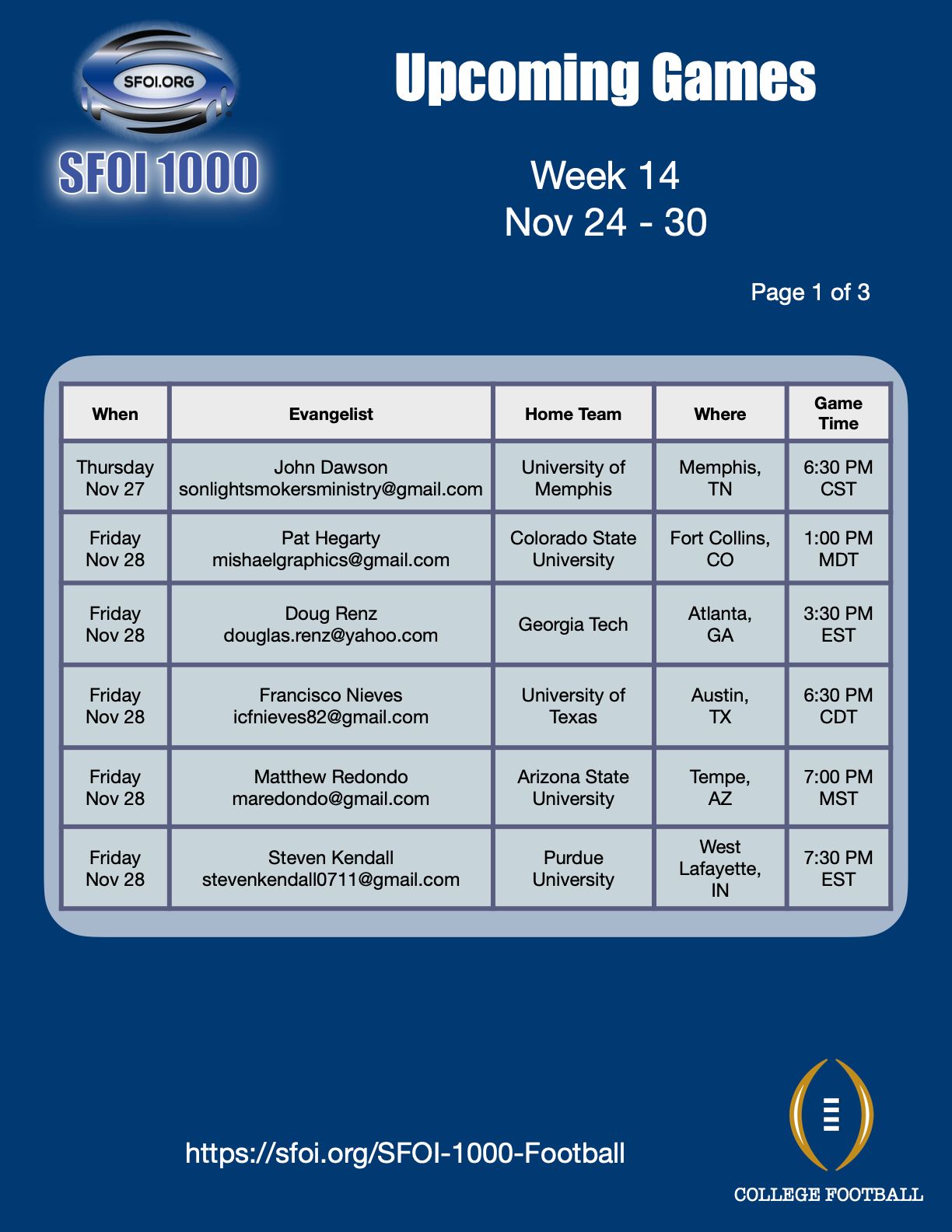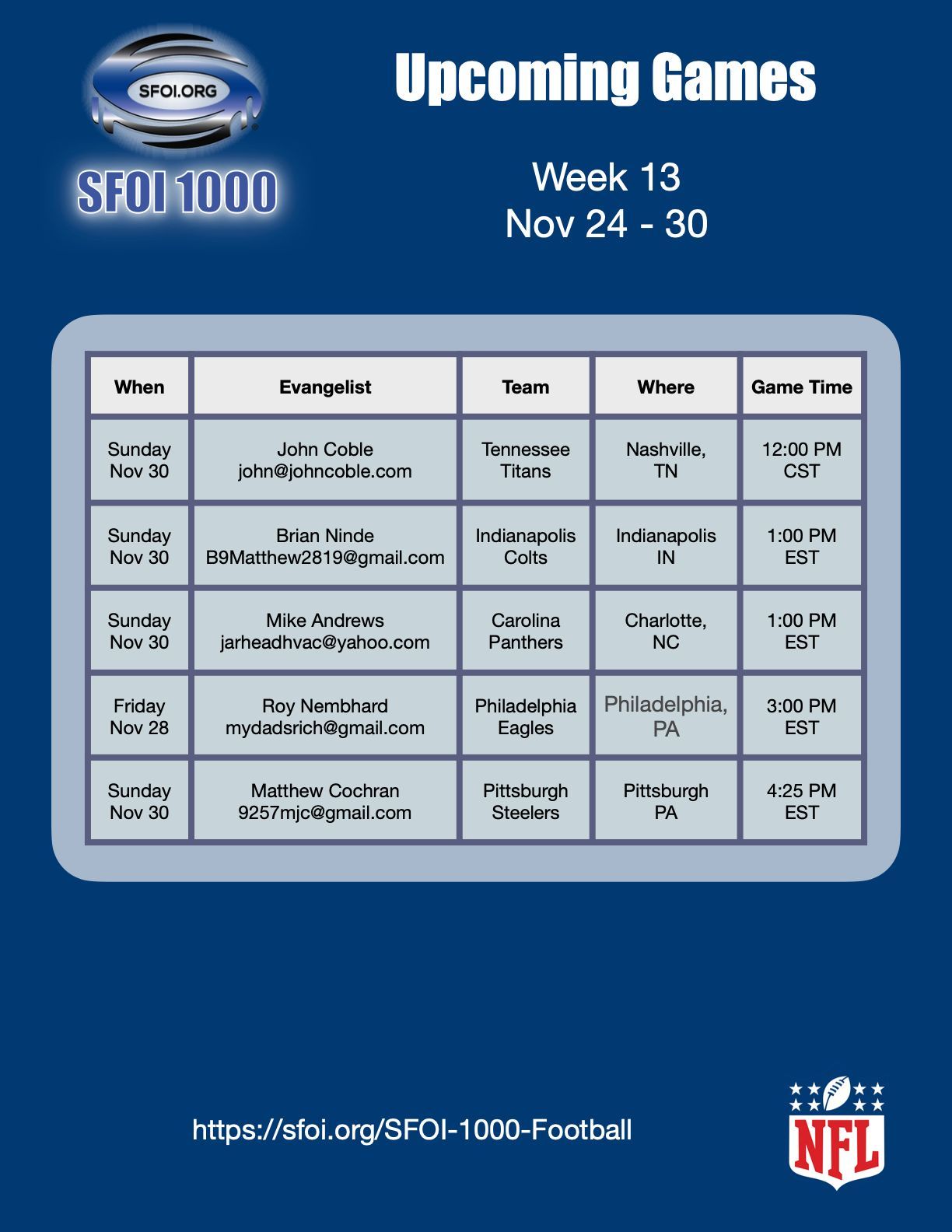 Herewith the schedule for the upcoming home game outreaches (Nov 24 - 30), as well as some feedback from evangelists that reached out last week (Nov 17 - 23)