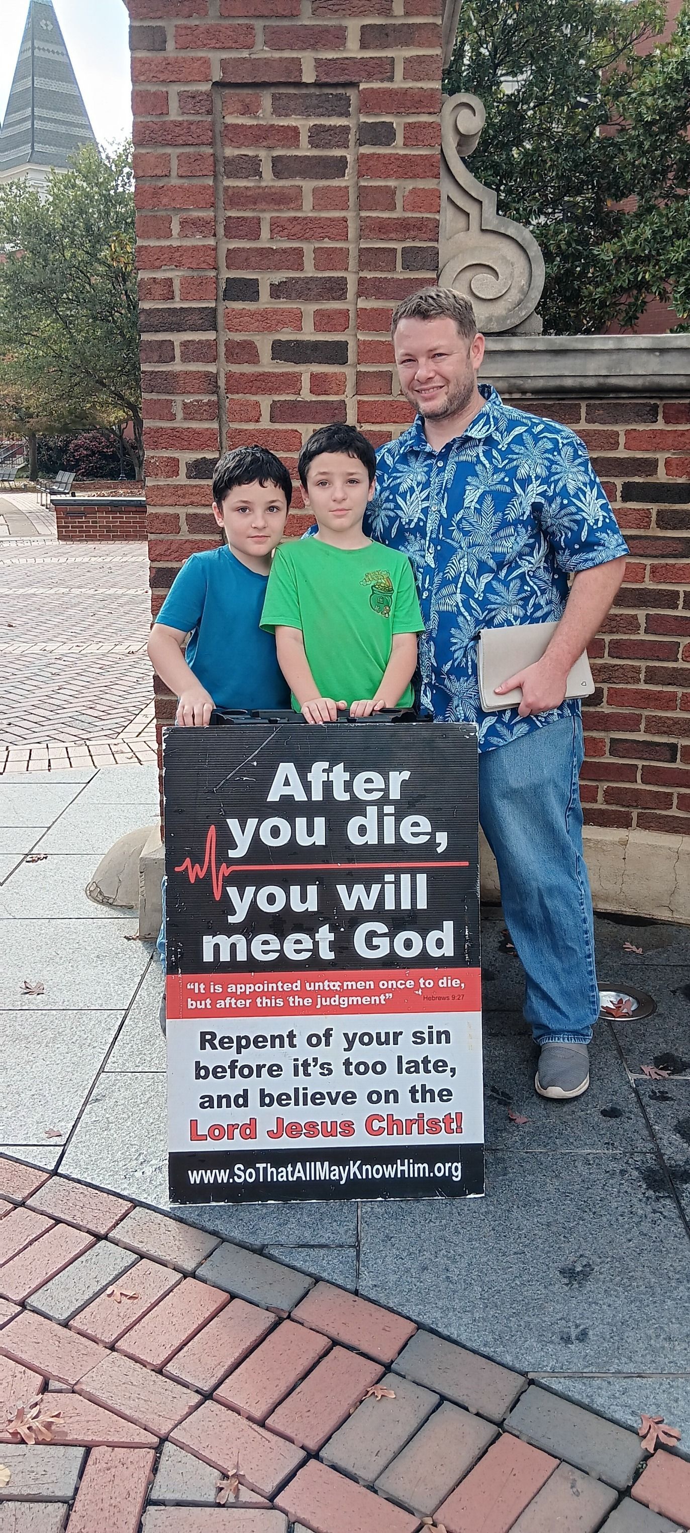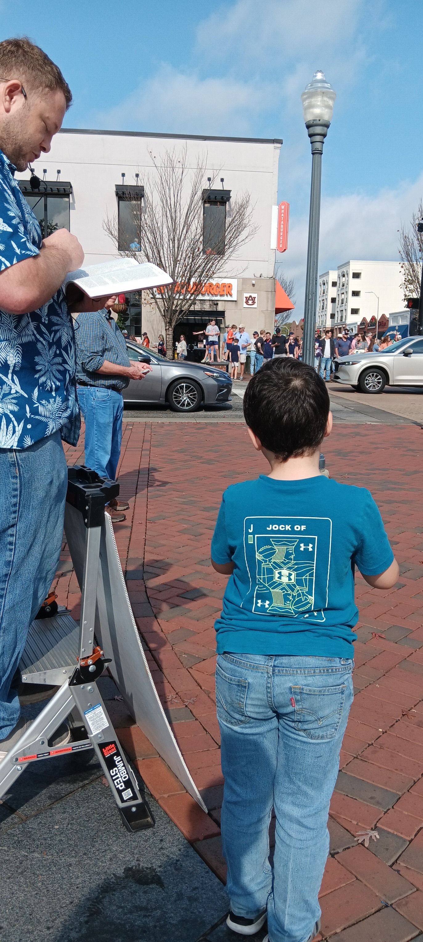 Kendall came with us to Auburn, and by God’s grace, he lifted his voice in the open air for the very first time. His two young sons stood beside hi,m passing out gospel tracts with joy, smiling at every soul who passed, and one of them even reading the Scriptures aloud with childlike boldness.