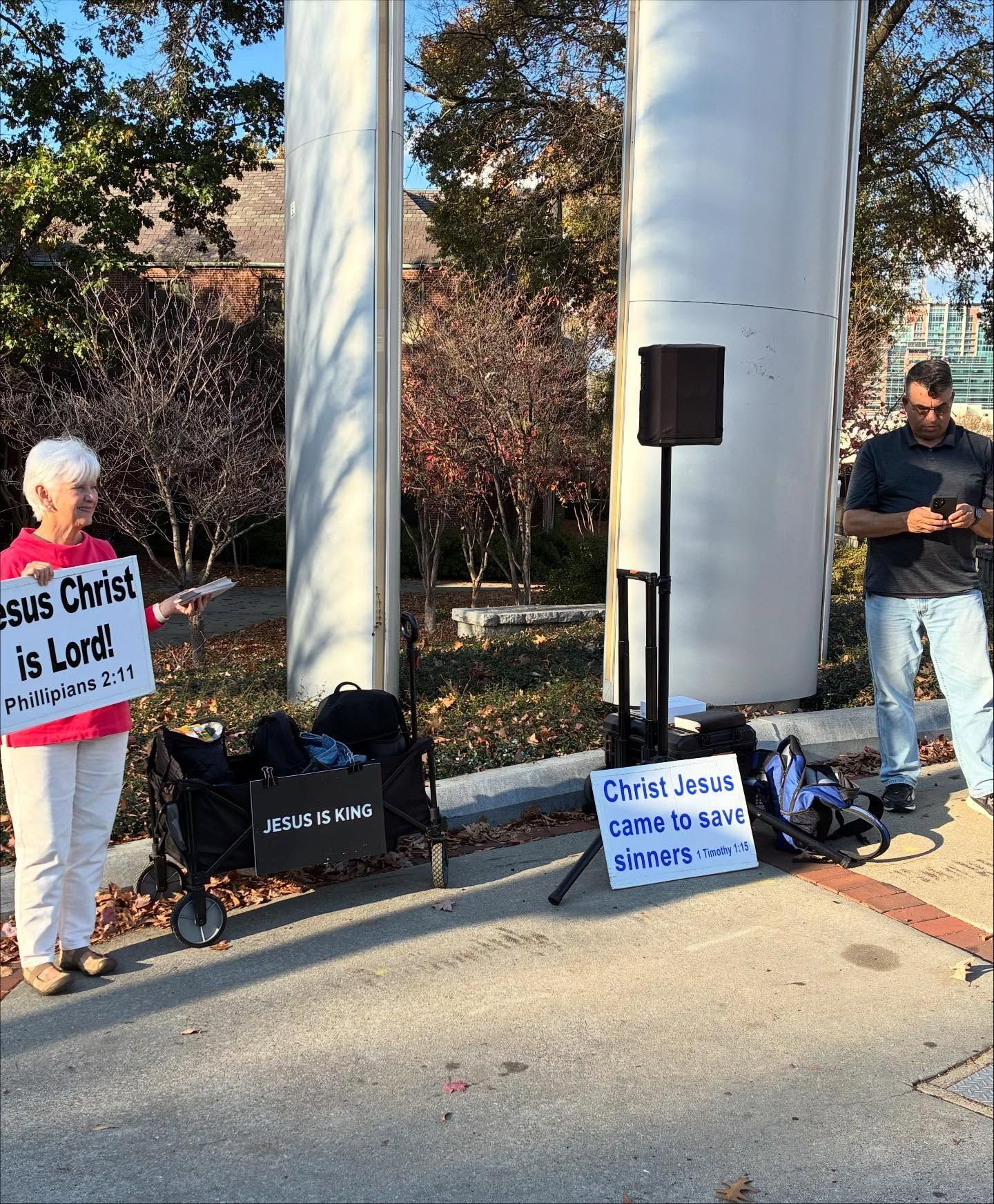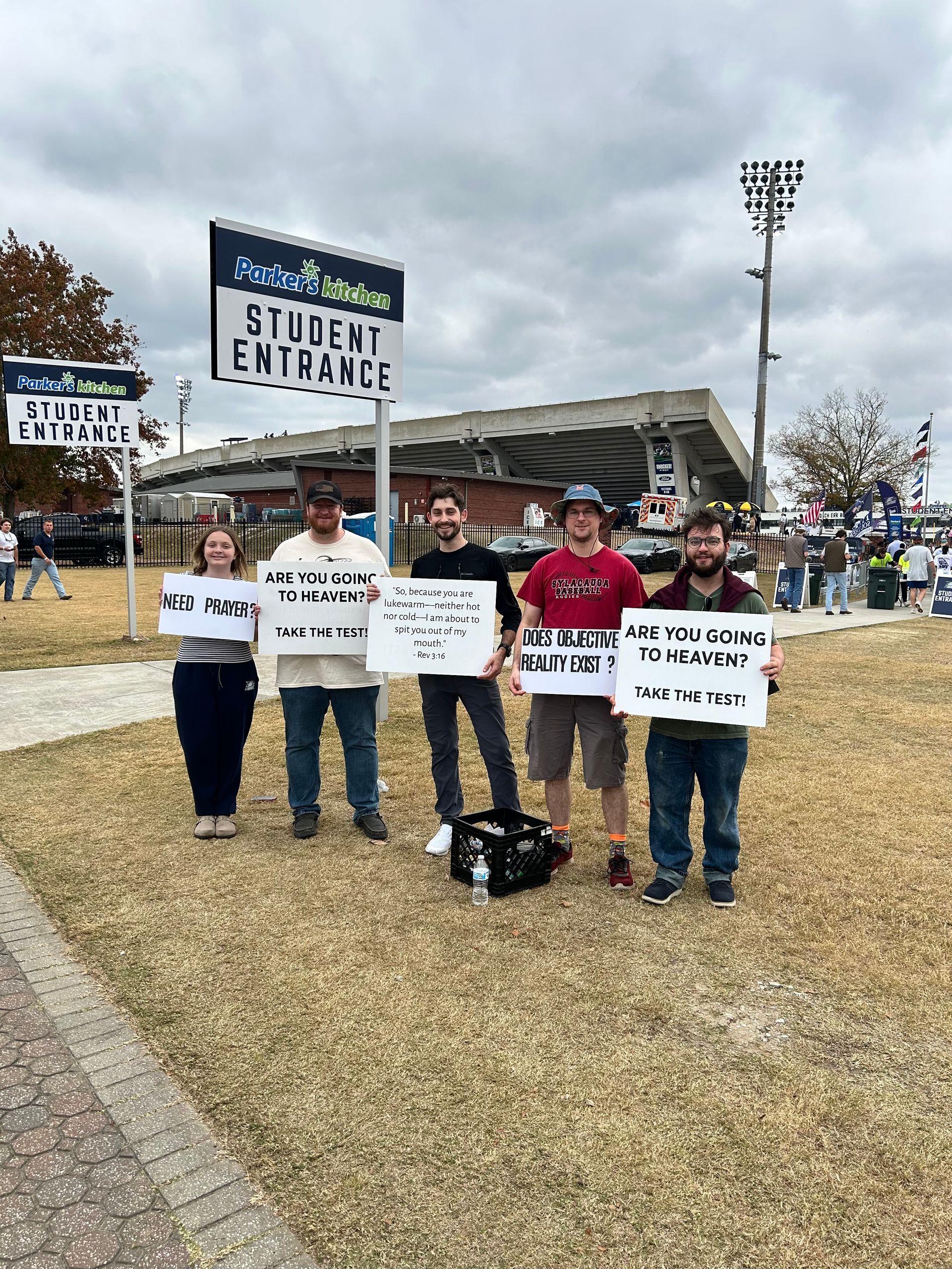 The crowds were slimmer than normal for the 1 PM kickoff. We set up in our usual spot and after a few minutes, Wesley scouted for another location with good foot traffic, and once he found one, Bailey and Daniel accompanied him. The interactions were pretty low compared to past outreaches, but Daniel had a good conversation with some believers, and Grayson spoke to two middle school aged kids who had their hope in Christ and encouraged them to keep the faith. Jim and Grayson Shaw preached and others held signs and passed out tracts. It has been a fruitful season outside of Paulson Stadium.