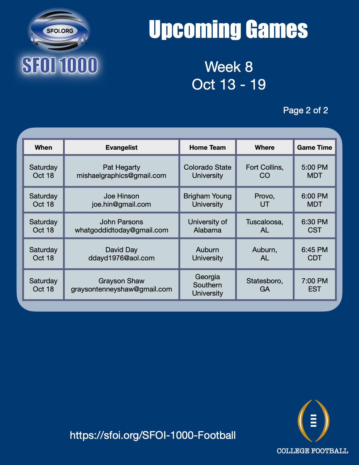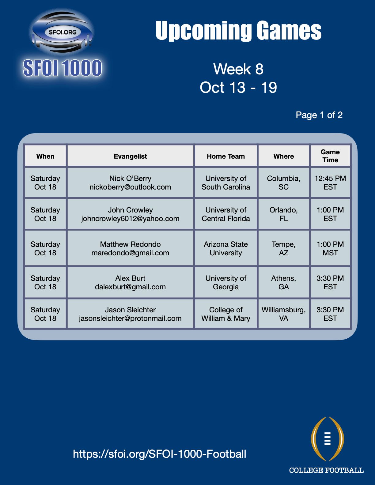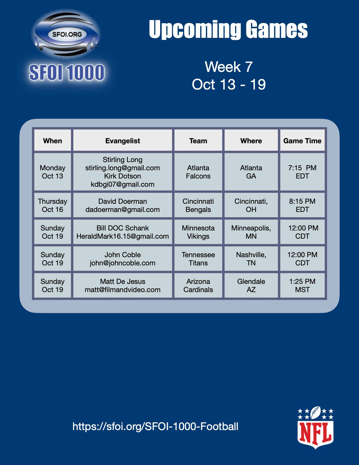 SFOI 1000 - Herewith the schedule for the upcoming home game outreaches (Oct 13-19), as well as some feedback from evangelists that reached out last week (Oct 6-12)