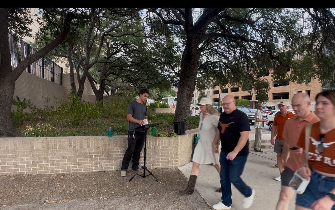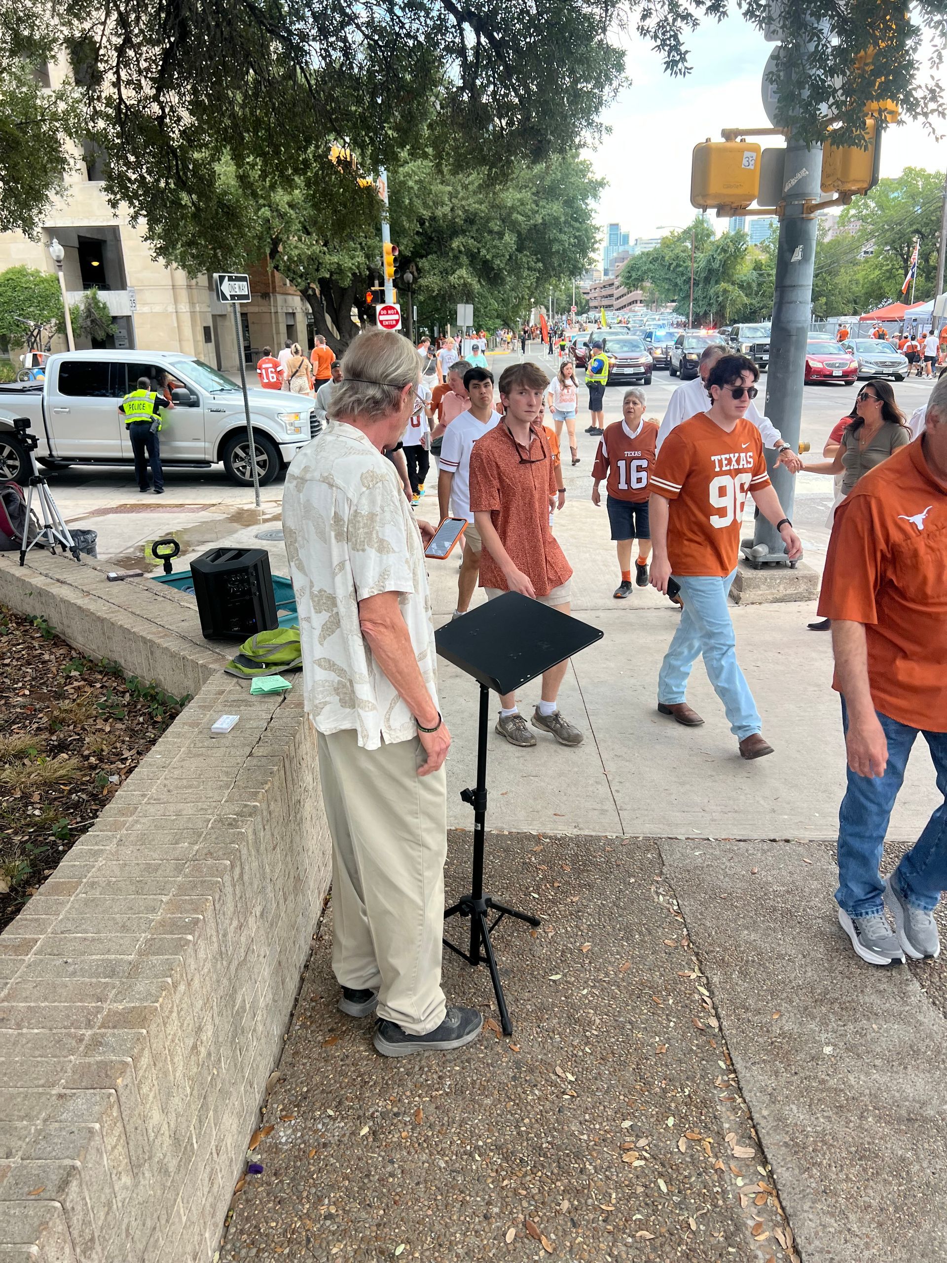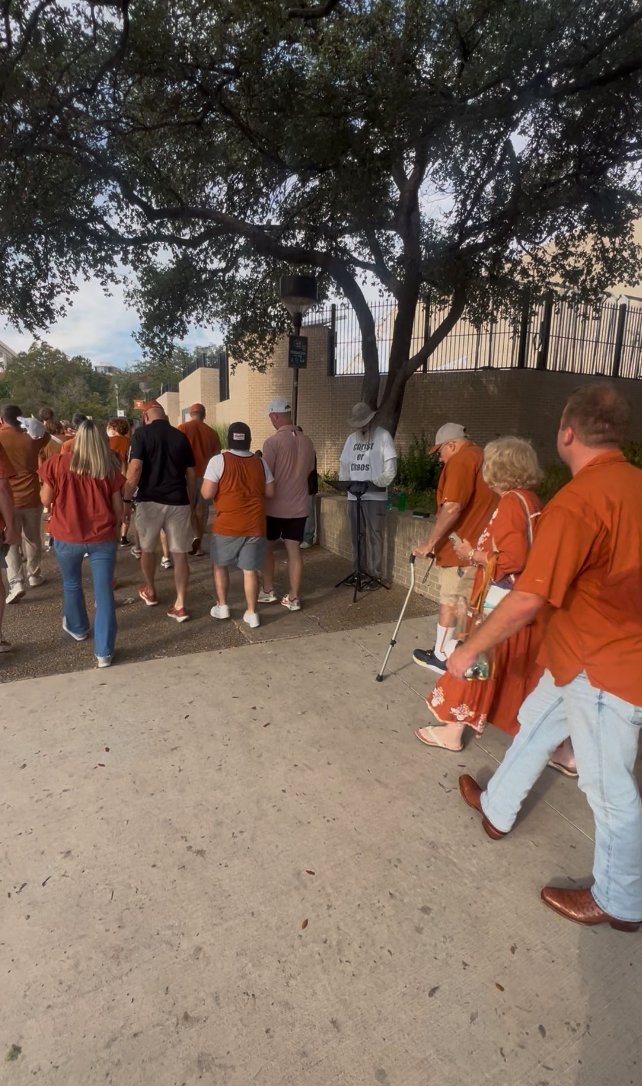 Today was the University of Memphis vs Arkansas Football Game. Proclaimed the word of The Lord from Mark 7:31-37, The Miracle of Hearing: Reawakening Our Spiritual Senses. Mike & Jenna Fergus had many conversations while I preached. Kobe, a Gen Z student who attends Bellevue Baptist Church, Dr Adrian Rogers' former church, walked up, thanked me and asked if he could pray over me. I said yes. I wish you could have heard Kobe's prayer as well as the look on passersby faces. They have moved the Pre Game Band Concert to the area that I preached at the first game. We moved to the other side of the street, being Faithful Witnesses to the calling of proclaiming The Gospel of Jesus Christ. Many heard the word, praying the Lord will open their ears, eyes, mind, souls while giving them understanding and calling them to Himself. That I will be faithful for each home game to proclaim His Gospel. Many came by thanking us for being there. Need more prayer warriors, those willing to have gospel conversations as people pass by & for others who would be willing to proclaim the word during pregame activities.