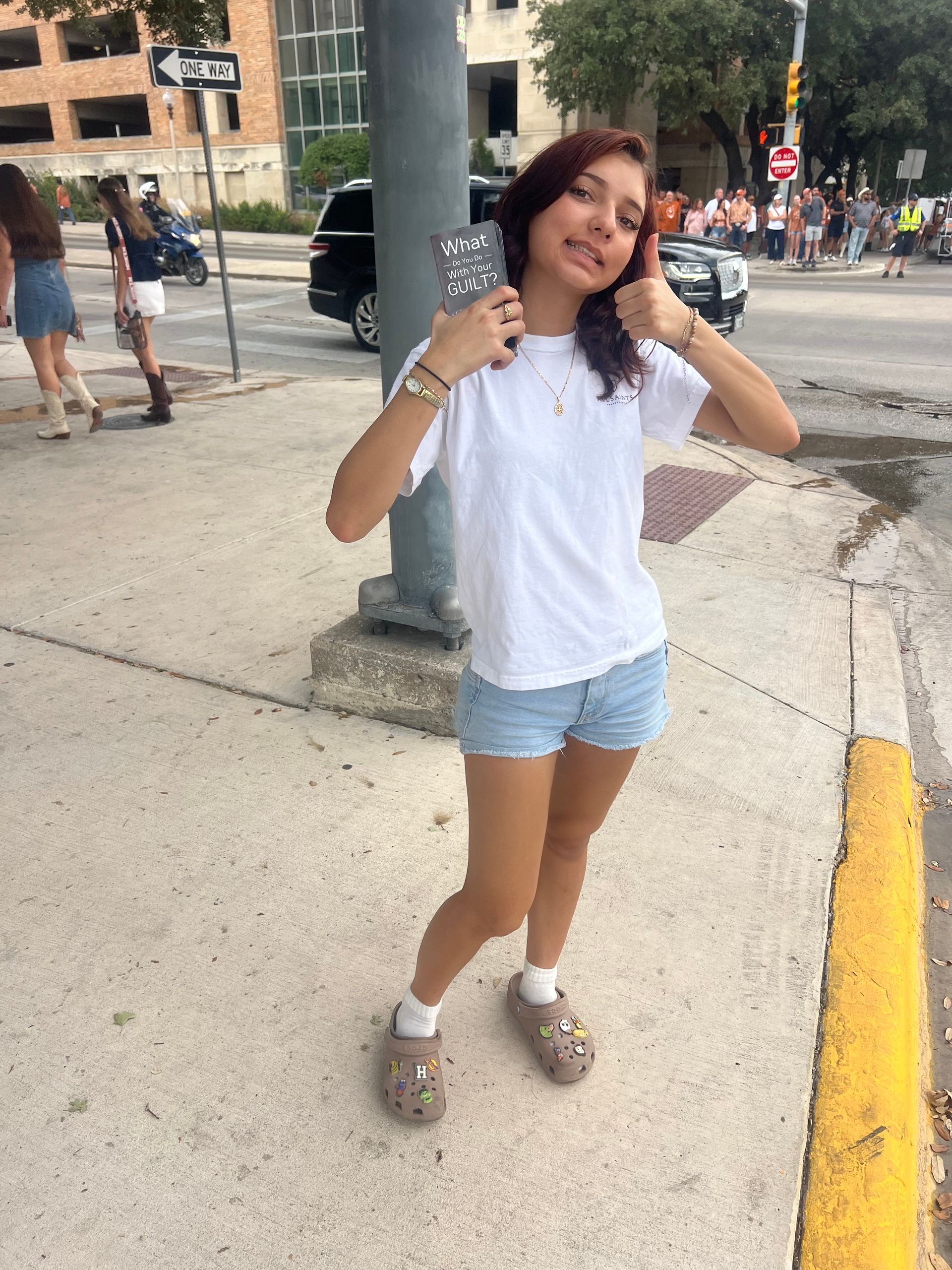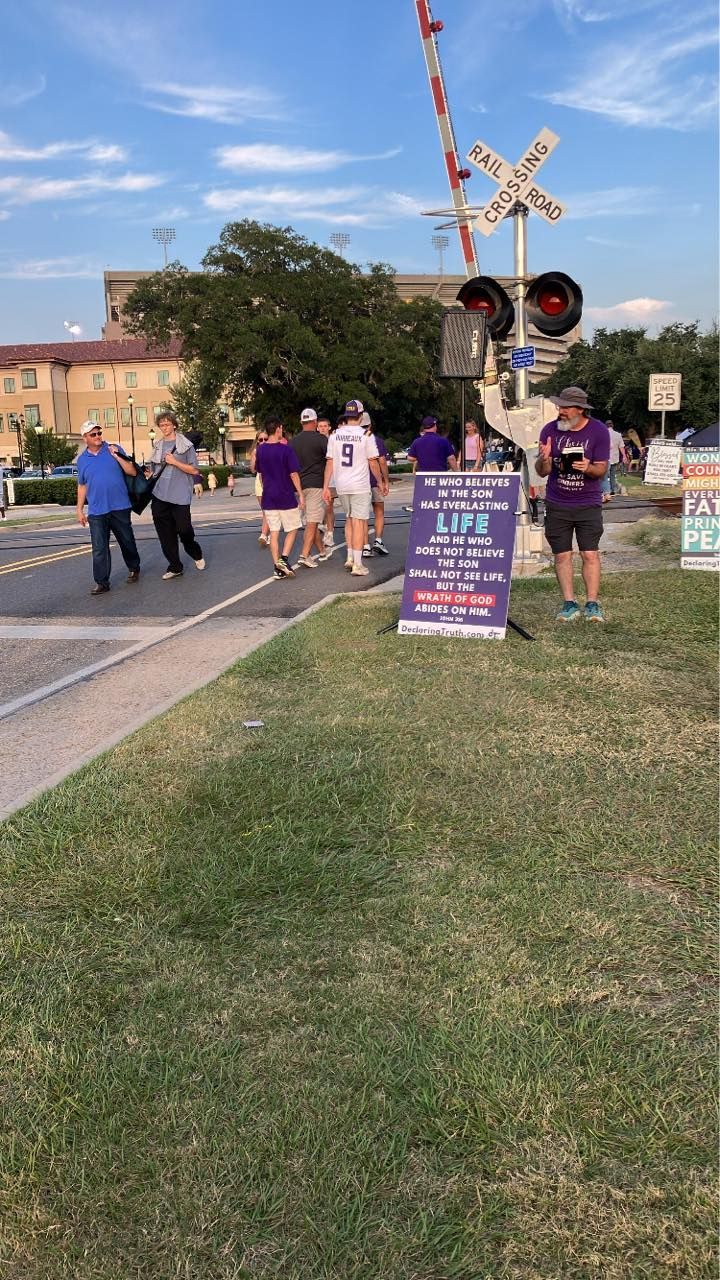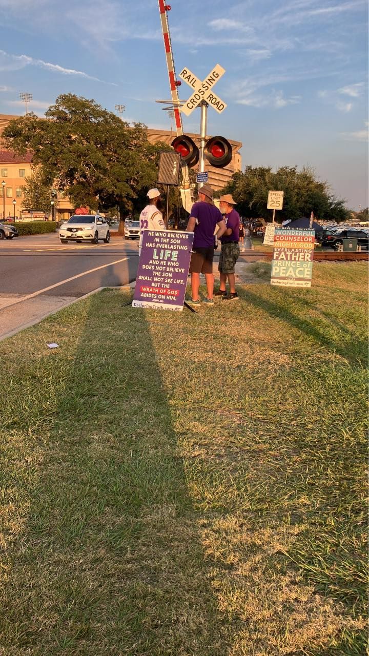 LSU vs SLU Evangelism. Zoe White and Jack Clark having a gospel conversation at the LSU vs SLU outreach. Another captive audience beginning to collect while Jack Clark reads the Word of God