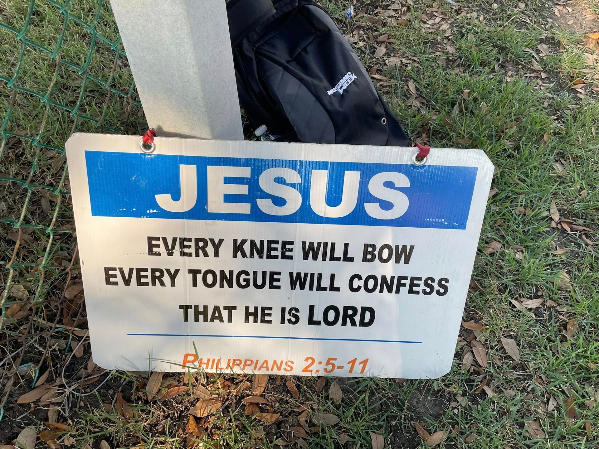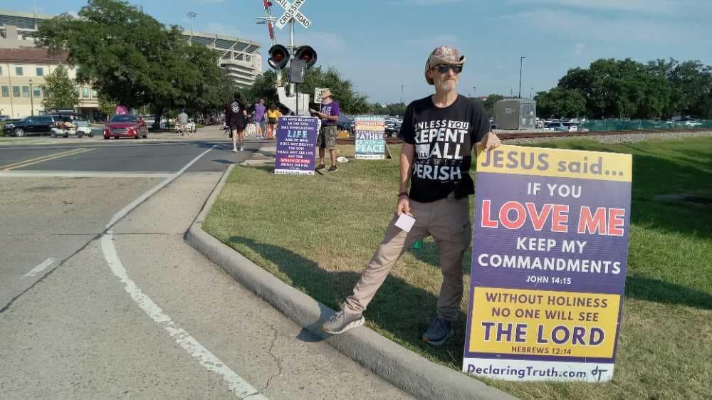 Two hours of preaching today at Georgia Tech. A smaller crowd and I met a few Christians today going today to the game. Only one driver shouted at me asking to talk to God to get a different president, then drove off. I concluded once it started raining hard. Glory to God!
