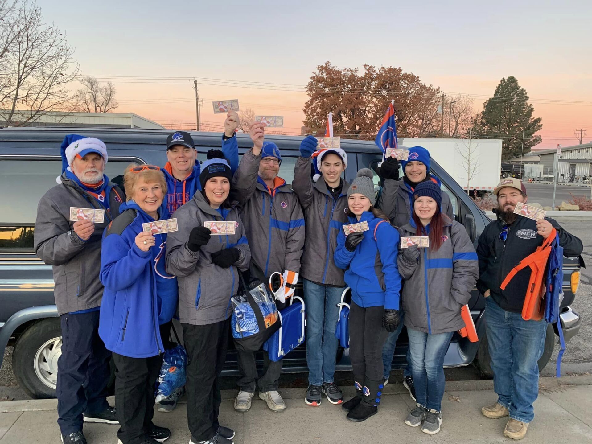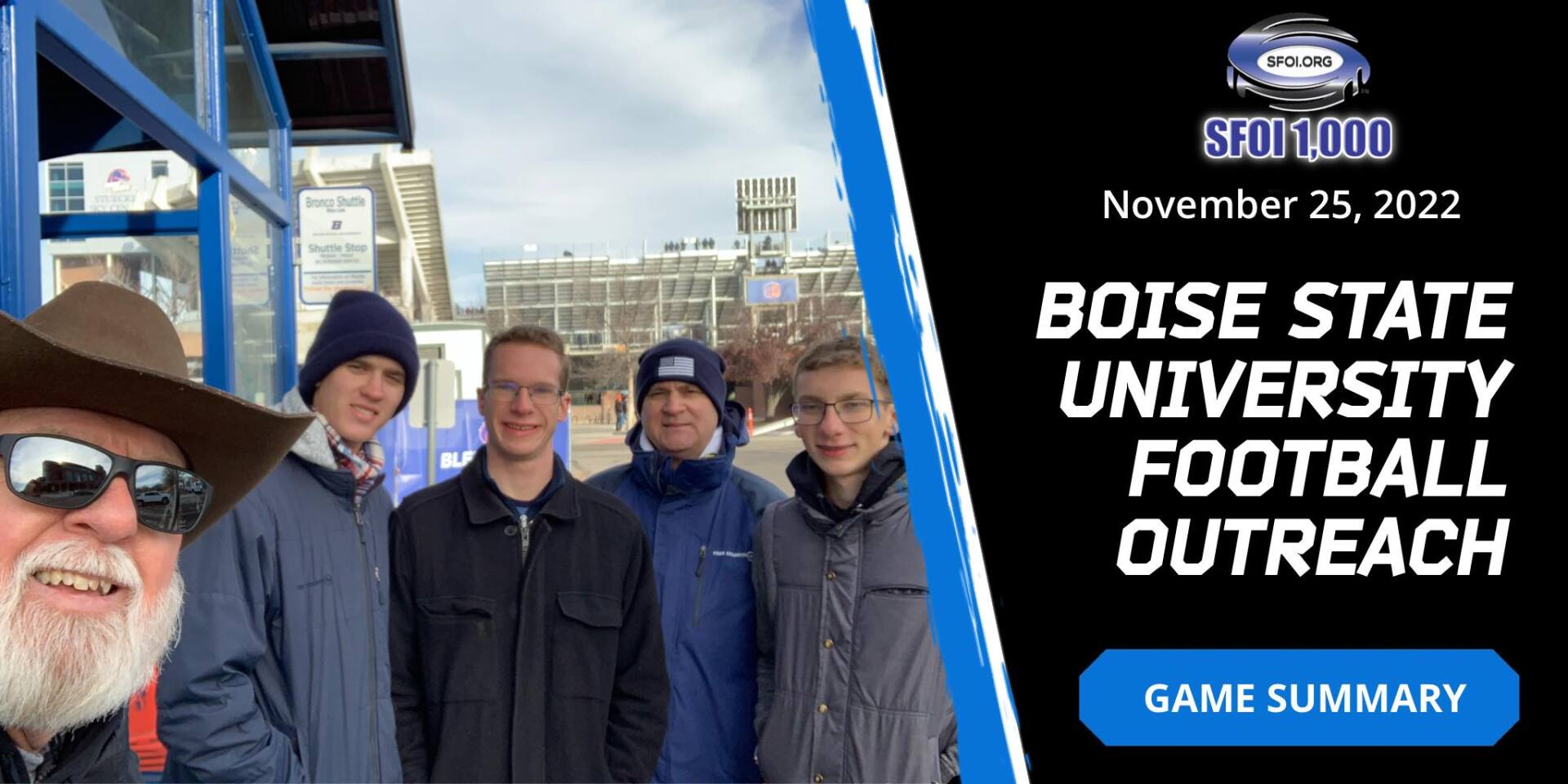 Due to holiday football TV scheduling, today’s Utah State/BSU game had a 10am kickoff. That meant that our SFOI outreach team needed to be on the ground at 8am to have a 2-hour outreach. Thankfully, it wasn’t as cold as it could have been with temps between 27 and 34 degrees and mostly clear skies. Also, the early start time helped us find a street parking spot about a block and a half from the stadium vs. 5-8 blocks normally.