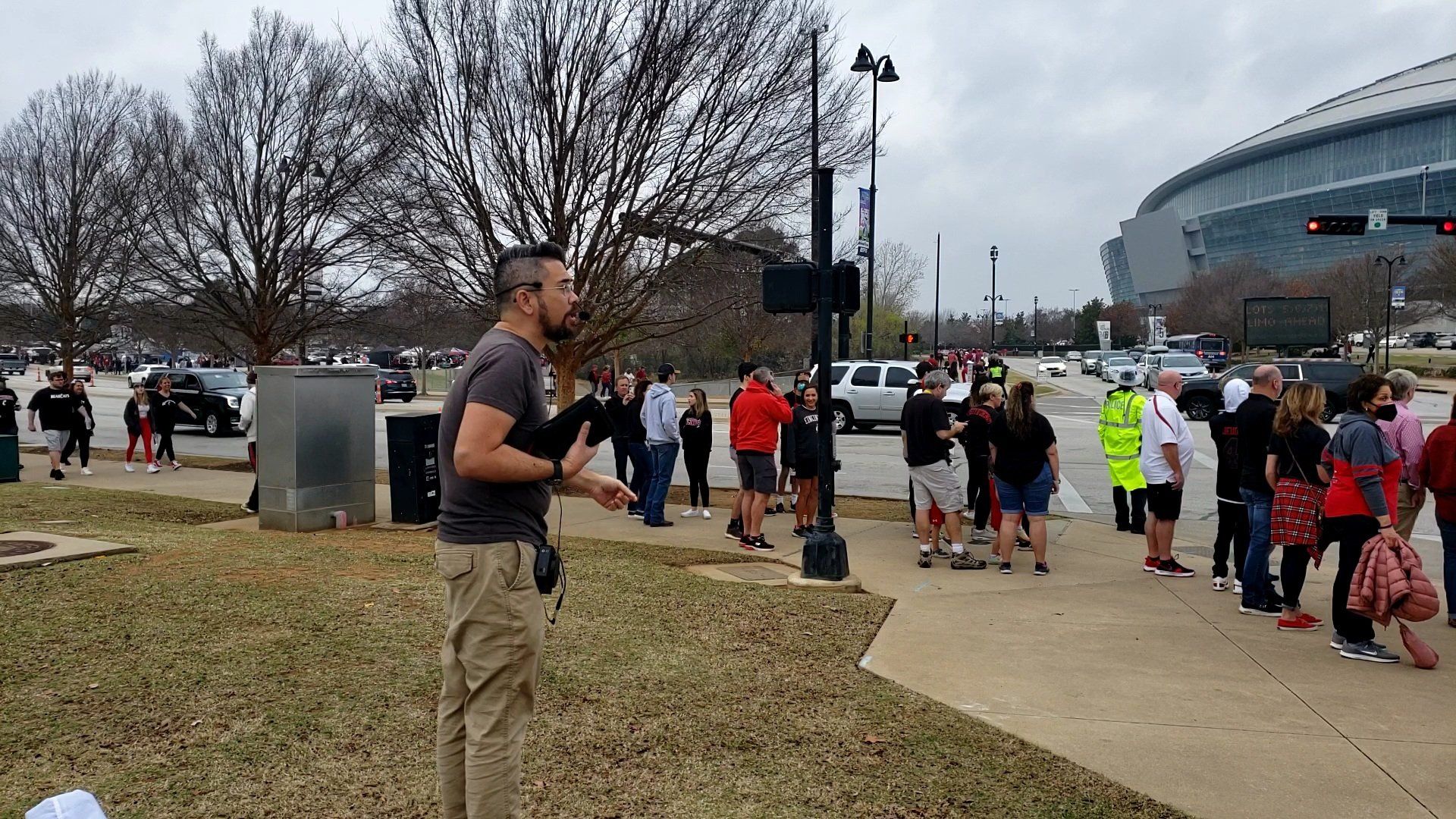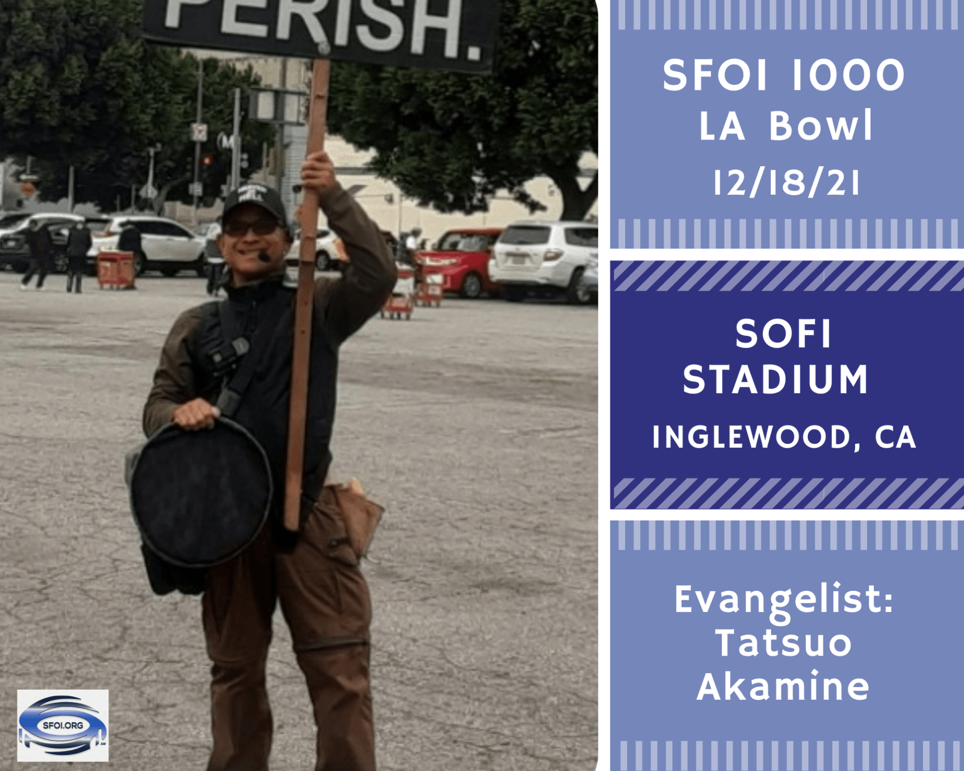 Pat Rauh and Joe preaching at the Cottonbowl classic at AT&T stadium in Arlington TX. A good outreach. Thousands of people walking by as we proclaimed the Gospel. With the help of my son we passed out hundreds of tracts.
