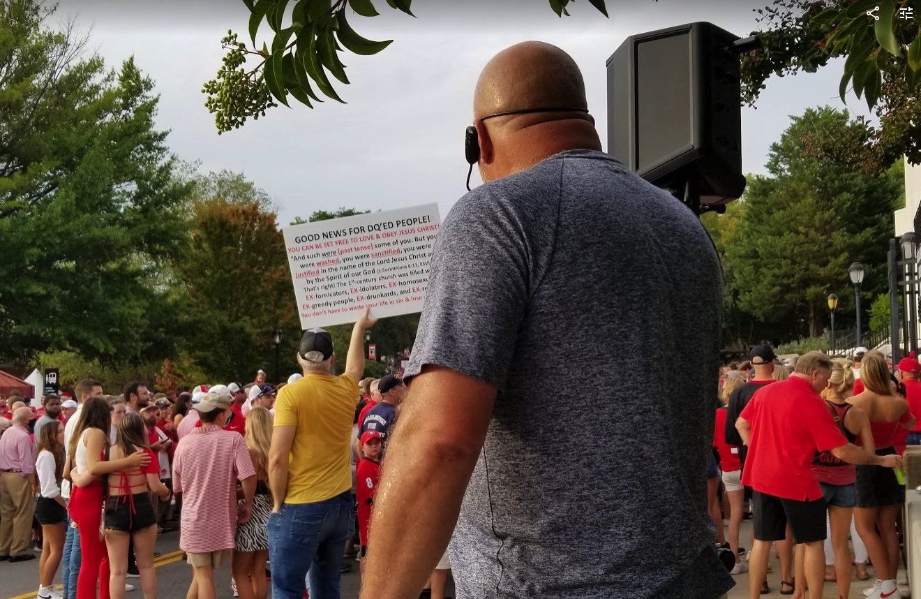 After Scott, I had the privilege of preaching for a while as the crowd grew even more at the gate, encouraging them to be redeemed to their Creator through repentance and faith and for those who profess to be Christians to examine themselves by 1 John to see if they are in fact true followers of Christ and asking the question, do you love Jesus more than your Georgia Bulldog?