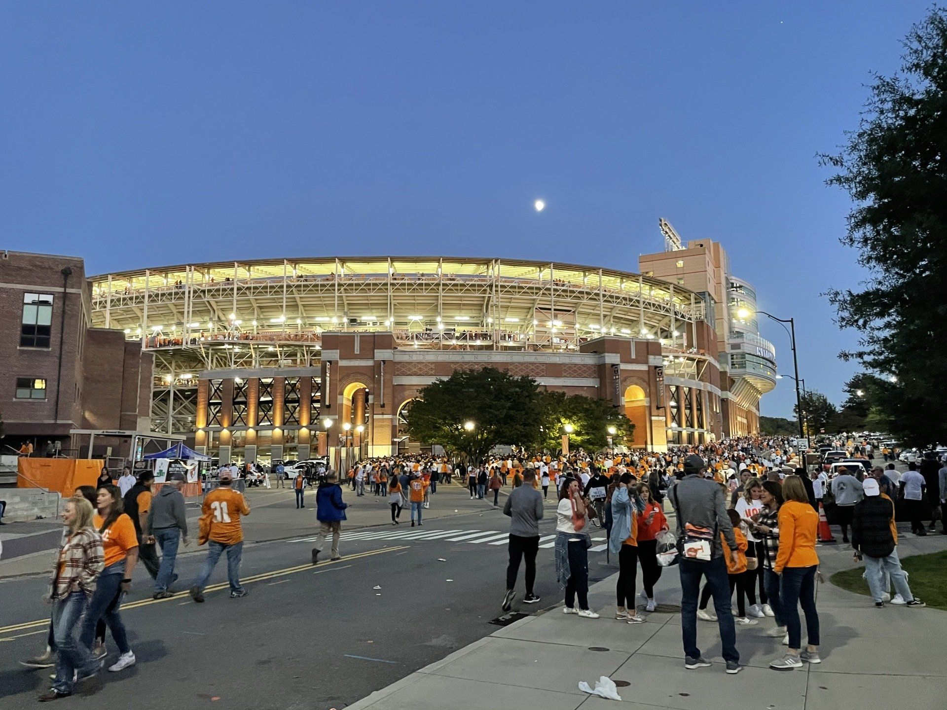 View from Phil Fulmer Drive of fans and Neyland Stadium before ministry begins. Big games bring lots of fans, increased enthusiasm and opportunities for souls who only attend the 'big game' to hear the Gospel.