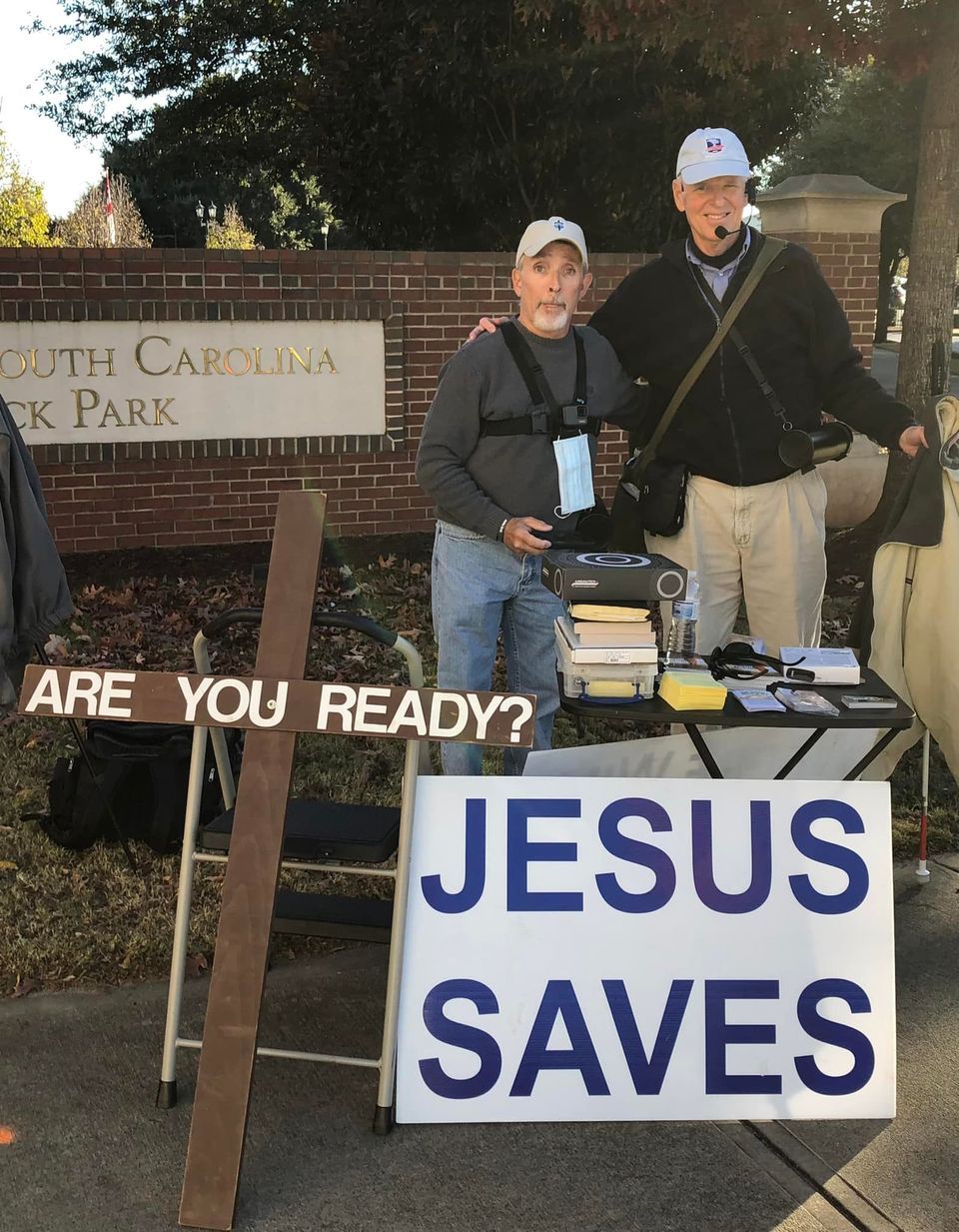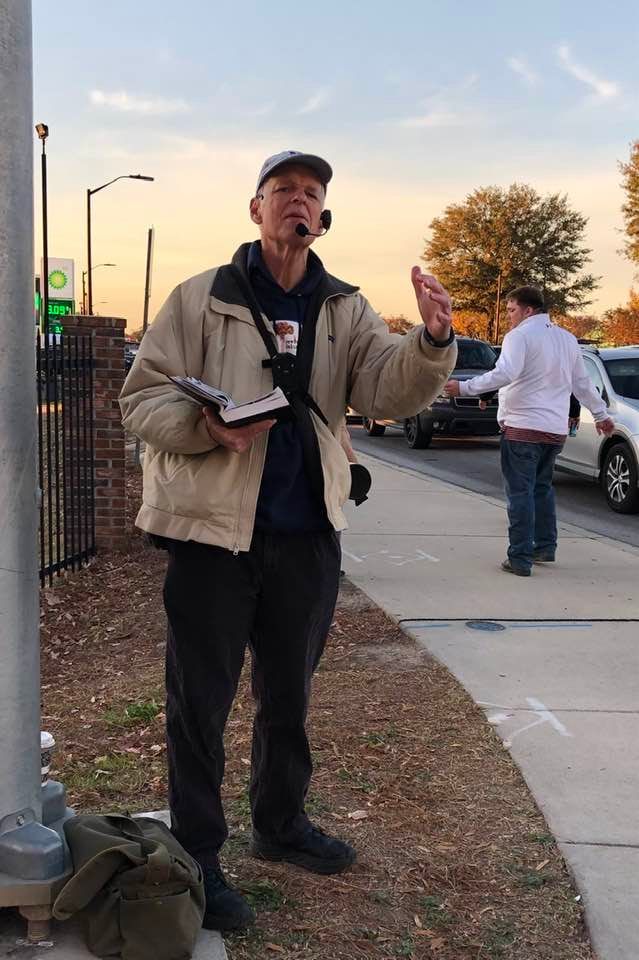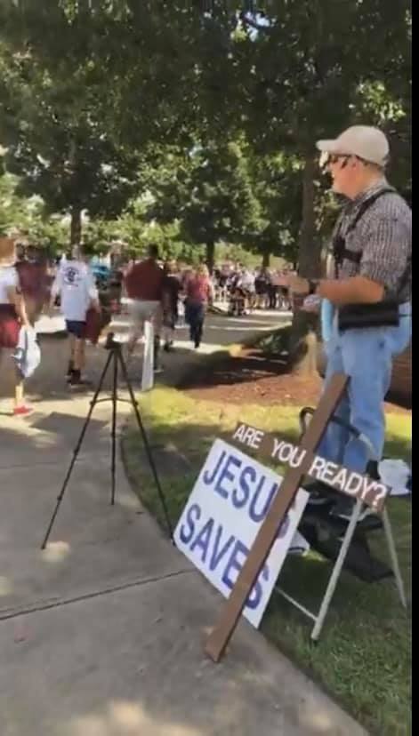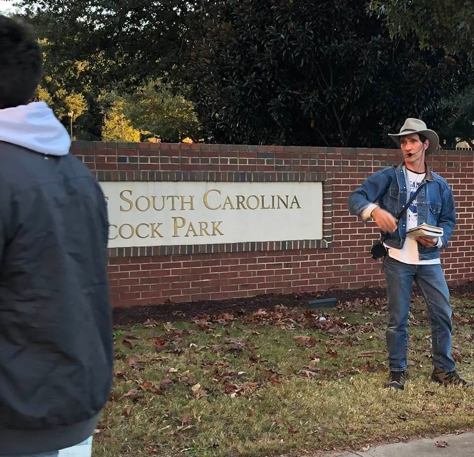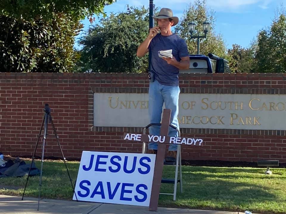 There were 12 faithful men and women scattered out along Bluff Avenue unashamedly sharing the Good News of Jesus Christ to fans headed to the Palmetto Bowl! Six of the men were publicly heralding Christ’s Saving Gospel while the other faithful soldiers of Christ were ministering through tract distribution and conversations as well.