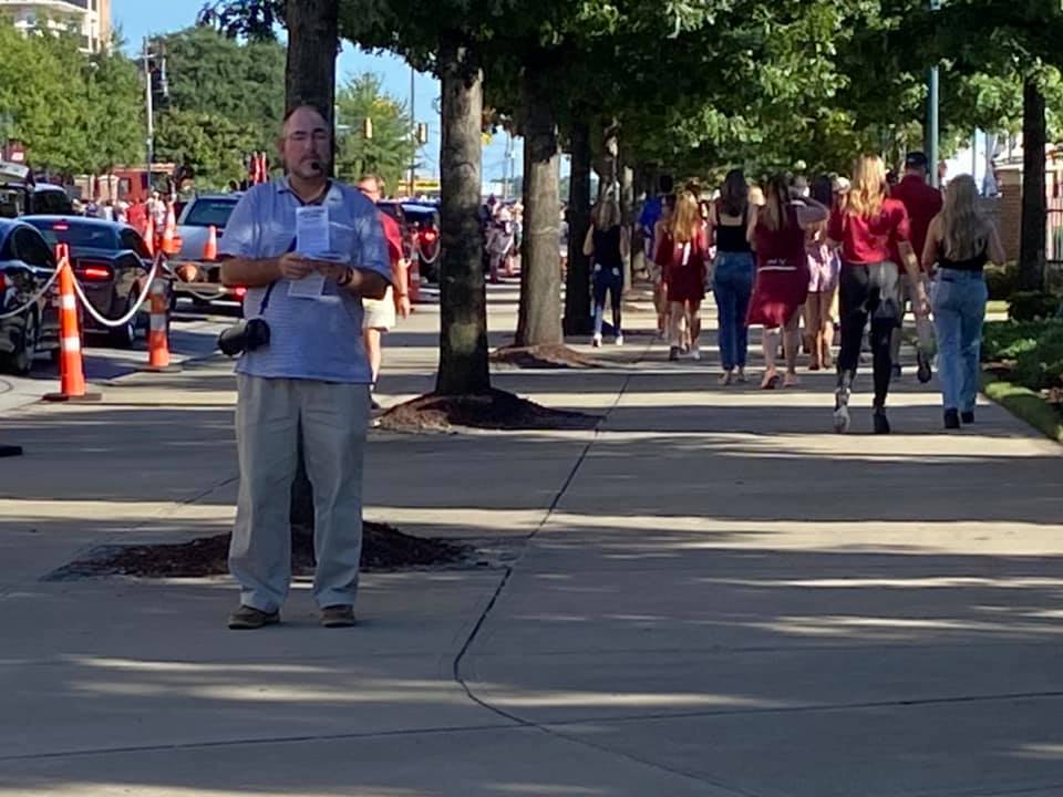 On the evening of 11/06/2021, thousands of men, women, and children heard the Saving Gospel of Jesus Christ proclaimed outside of the William Brice Stadium in downtown Columbia. Four men armed with the Good News of Jesus Christ, crucified and risen from the grave, took their positions in three different locations across the street from the stadium. For about three consecutive hours, the Name of Jesus Christ was lifted up through Gospel proclamation, one on one conversations, and Gospel tract distribution. “To the Praise of His Glory!”