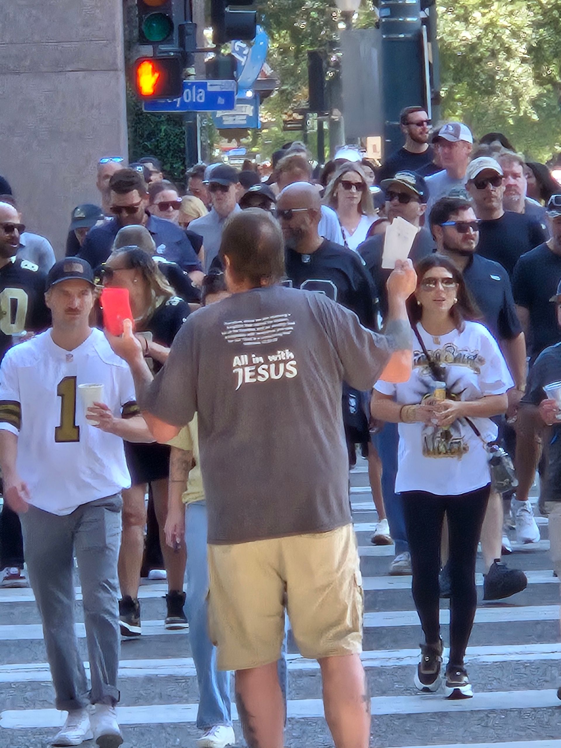 On Sunday, December 15, 2024, Jimmy, Harvey, and David were in New Orleans for evangelism purposes. For three hours prior to the Saints/Commanders game, we open-air preached, distributed about 300 gospel tracts, and 130 Ten Commandment doubloons.