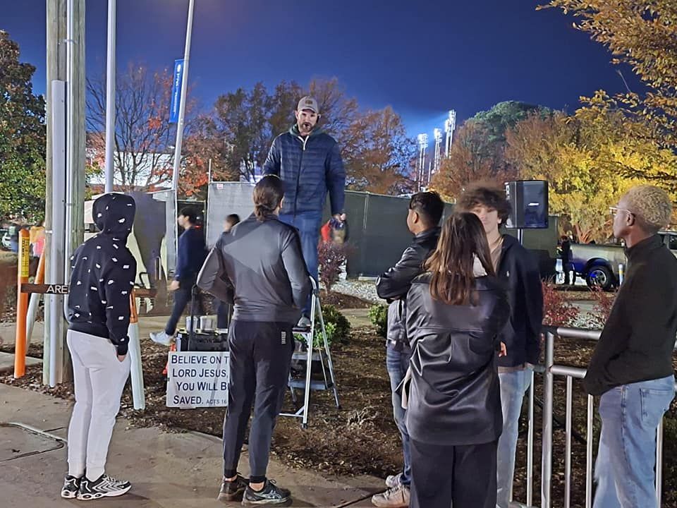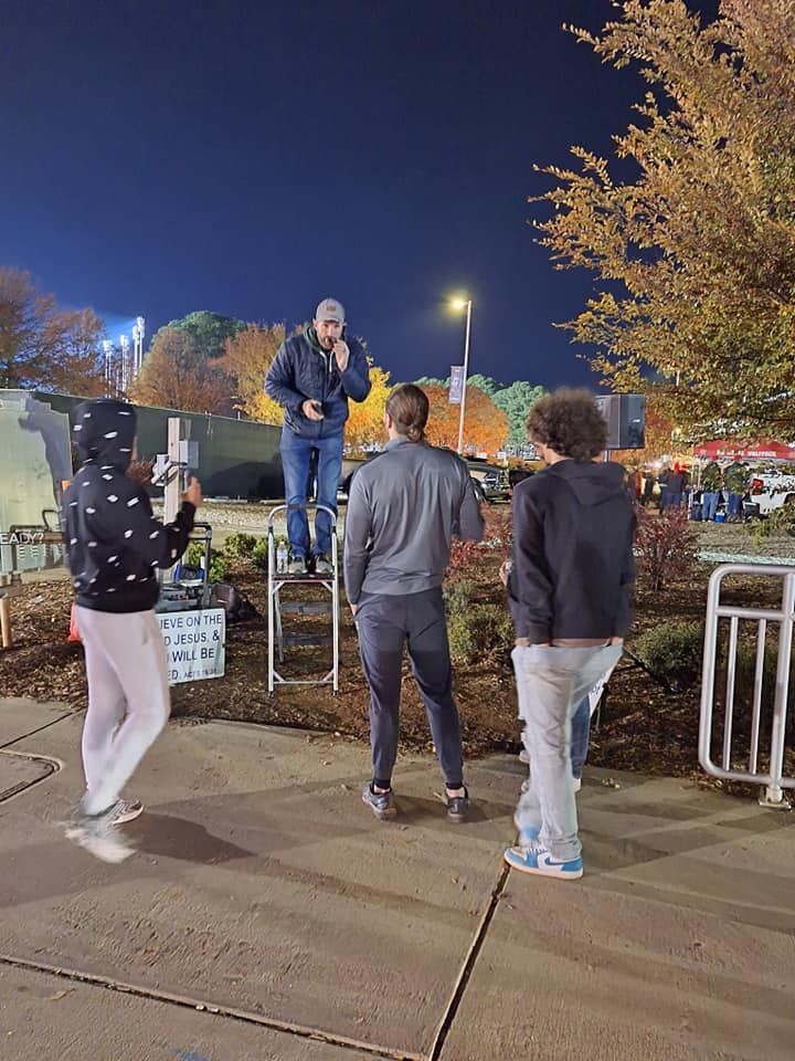 Blessed to have a team of eight men proclaiming the gospel at the NC State game tonight. Thousands of people heard about Jesus, and lots of gospel literature was passed out.